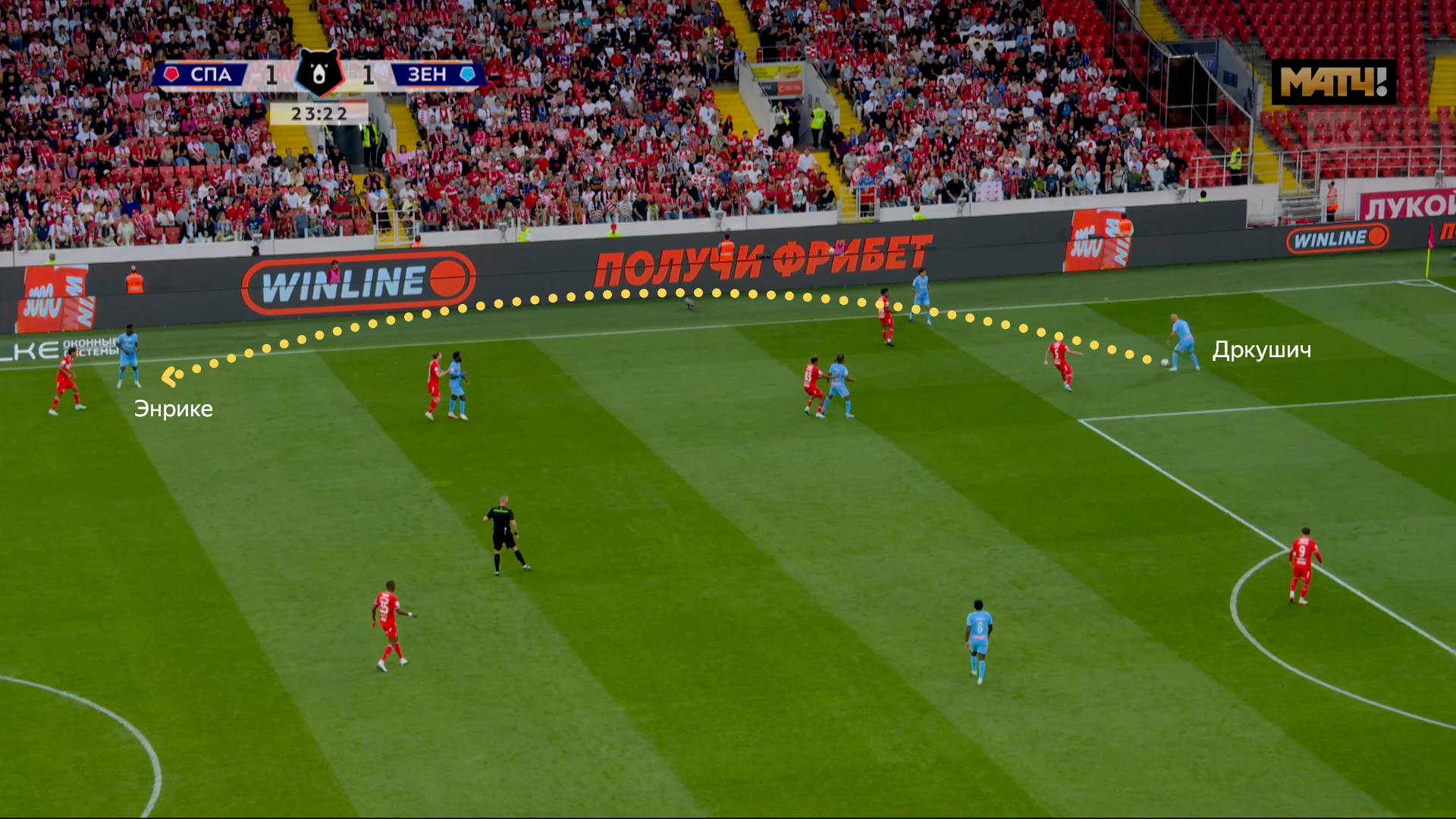 Что было у «Зенита»? Команда Семака постоянно пыталась выходить через длинные передачи по флангам. Частым адресатом становился Луис Энрике на правом краю. Многие атаки гостей развивались по следующему шаблону: вратарь разыгрывает с центральными защитниками, а дальше идет длинная передача. Либо Адамов сразу мог начинать от ворот передачей вперед.