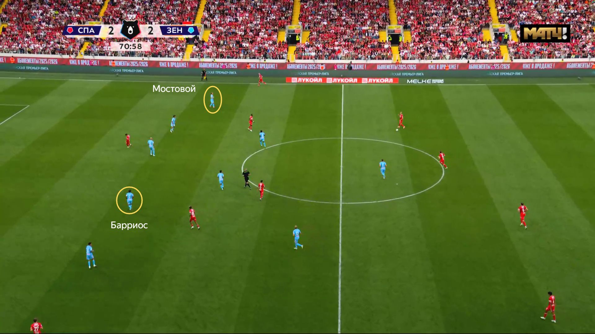 Изначально во втором тайме Семак перевел команду фактически на игру с пятеркой сзади за счет более глубокой позиции Барриоса. Вперед вышел Соболев. С большой вероятностью с целью добавить адресата для длинных передач в центр, а не на фланг (как это было с Луисом Энрике).