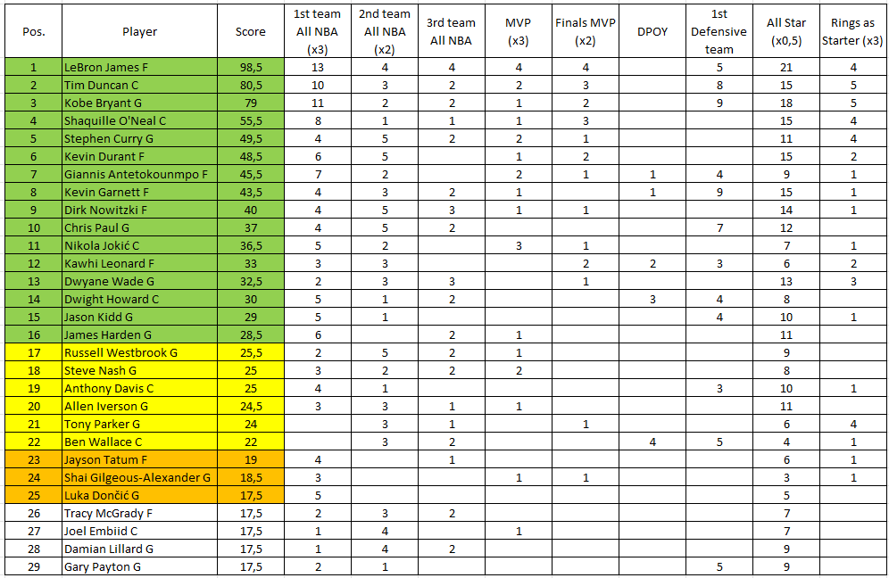 Думаю, это исчерпывающий перечень критериев и спорить здесь можно только по весам каждого параметра. Можно сказать, что MVP сезона, по сути, получает 6 очков (3 за МВП и 3 за первую сборную), поэтому конкретно за МВП можно было бы дать чуть меньше. Для кого-то может показаться неправильным давать одинаковое количество очков за чемпионство и первую сборную, кто-то может сказать, что MVP финала это итог всего одной серии, а не всего плей-офф и 2 очка это почти как MVP сезона, но, поразмыслив какое-то время над этими весами, я пришел к выводу, что они вряд ли существенно повлияют на то, кто попадет в топ 25, а внутри топа в любом случае можно будет делать какие-то перестановки близких претендентов на свое вкусовое усмотрение (ведь это голосование, и оно индивидуальное)