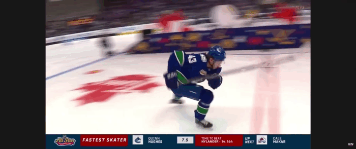На примере выше, переход Куинна Хьюза на двухопорное катание во время входа в закругление на конкурсе «All Stars Fastest Skater 2024» – это была его основная ошибка, которая привела к его замедлению, и он тут же сильно отстал от МакДэвида, это видно на синхронизированном забеге ниже – после первого виража в кроссовере отставание составляло примерно в два корпуса, после второго виража в двухопорном положении отставание значительно увеличилось.