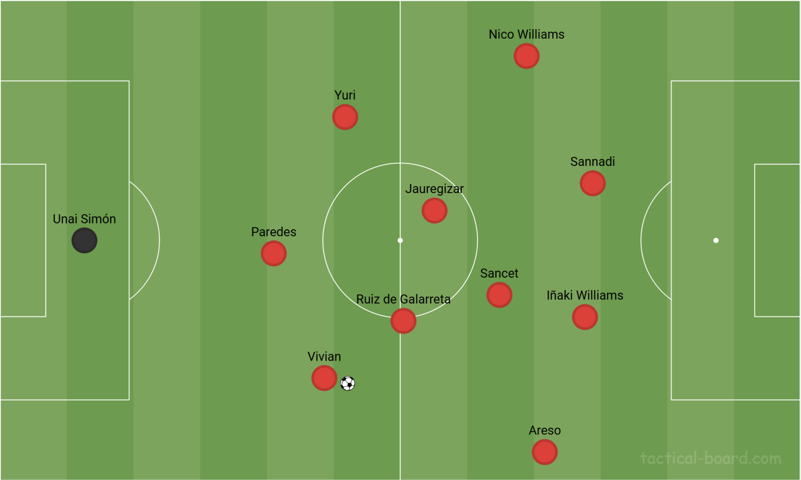 На левом фланге — Юри Берчиче и Нико Уильямс. Это уже отлаженная связка: Юри чаще остаётся сзади, чтобы дать Нико свободу для обострений. На правом фланге теперь могут действовать Аресо и Иняки Уильямс — и здесь есть шанс на интересную перестройку.