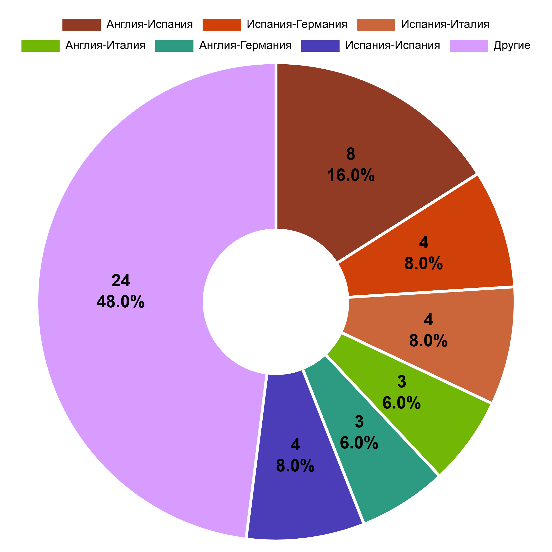 Как видно, на перечисленные выше шесть пар в сумме приходится 26 из 50 официальных розыгрышей Суперкубка УЕФА, то есть 52 процента! Но это логично – в большинстве случаев еврокубки выигрывают представители топовых чемпионатов.
