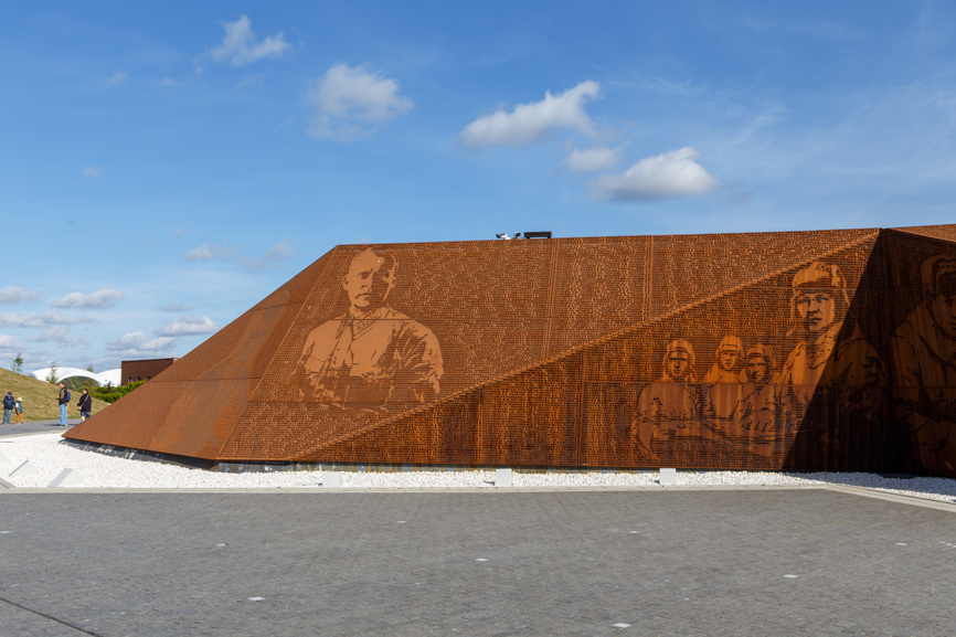 Место реально впечатляет, даже если вы не фанат истории. Мемориал стоит в деревне Толстиково, Тверская область, недалеко от трассы М9. Главный элемент – огромная бронзовая фигура солдата, 25 метров высотой и 80 тонн веса. Он словно парит над коридором из стальных плит с выгравированными именами павших, и создается ощущение, что каждый шаг здесь важен. Чувствуешь масштаб того, что произошло во время битвы под Ржевом в 1942–1943 годах, когда погибло почти 777 тысяч человек.