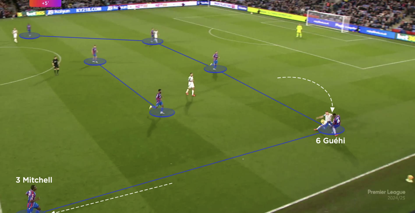 Гехи отвечал за зону между левым центральным и левым флангом — помогал Тайрику Митчеллу, закрывал рывки соперников и страховал зону при смене фланга. Если соперник играл широко, он часто выходил навстречу, перекрывая край или вступая в отбор против дриблеров.