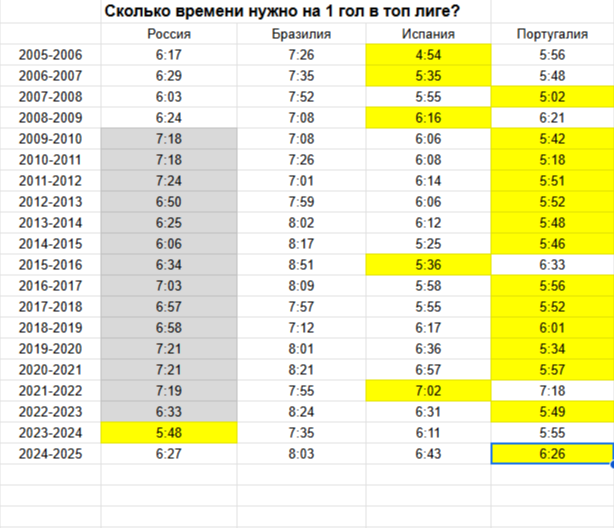 Если смотреть в комплексе, российская суперлига занимает третье место по среднему времени на гол, уверенно опережая Бразилию. В России в среднем 6:00-6:30 минут нужно для гола, исключение составляют период адаптации к нововведениям и кризисные годы.