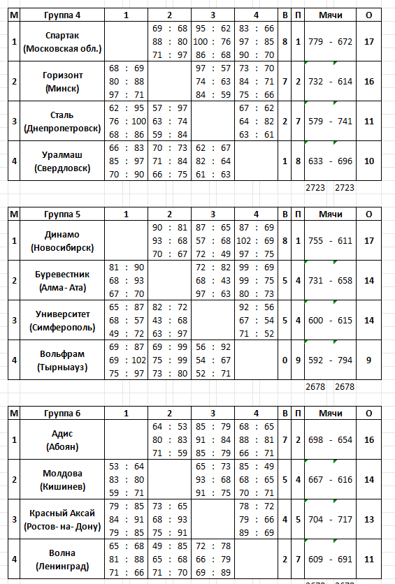 Нечто подобное случилось и в четвертой группе в противостоянии подмосковного «Спартака» и «Горизонта». Спартаковки два первых матча выиграли, а в Минске уступили — 71:97, но остались на первом месте: у «Спартака» в итоге все те же 17 очков, у «Горизонта» — 16.