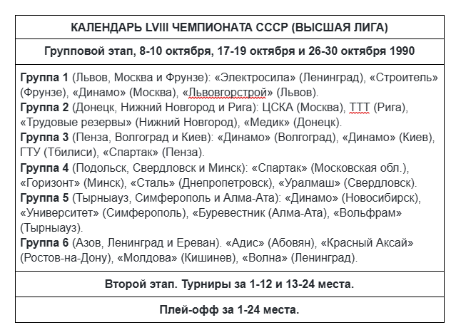 … Состав участников LVIII ЧЕМПИОНАТА СССР (ВЫСШАЯ ЛИГА) впервые формировался как по-спортивному, так и финансовому принципу. Важно, чтобы команда могла не только оплатить стартовый взнос, но и гарантированно доиграть до финиша чемпионата. К одиннадцать командам-участникам чемпионата СССР-1990 («Электросила», ЦСКА, волгоградское, новосибирское, киевское и московское «Динамо», подмосковный «Спартак», «Молдова», «Адис», «Буревестник» (в прошлом сезоне — алма-атинский «Университет»), «Горизонт» добавили еще тринадцать. Вот названия команд, неожиданно получивших повышение в классе: «Строитель» (Фрунзе), «Львовгорстрой» (Львов), ТTT (Рига), «Трудовые резервы» (Нижний Новгород), «Медик» (Донецк), ГТУ (Тбилиси), «Спартак» (Пенза), «Сталь» (Днепропетровск), «Уралмаш» (Свердловск), «Университет» (Симферополь), «Вольфрам» (Тырныауз), «Красный Аксай» (Ростов-на-Дону), «Волна» (Ленинград). Конечно, 21-кратного чемпиона СССР ТТТ, а также завоевывавших медали первенства страны «Уралмаш» и грузинский ГТУ (ГПИ) сложно было назвать дебютантами. Другие команды, к примеру, тот же «Вольфрам», впервые появились среди баскетбольной элиты.