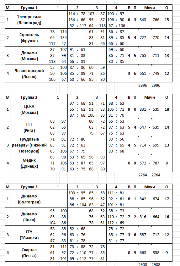 В первой группе острая борьба за второе место развернулась между «Строителем» и московским «Динамо». В третьем туре во Фрунзе хозяйки паркета, подгоняемые своими зрителями, победили — 81:66 и обошли москвичек. Первое заняла «Электросила», которая выиграла все матчи первого и второго круга, а на третий послала дублеров. Во всех трех матчах во Фрунзе действующий чемпион СССР потерпел разгромные поражения: в игре со «Строителем» — 52:112, с «Динамо» (Москва) — 64:116, с «Львовгорстроем» — 67:106.