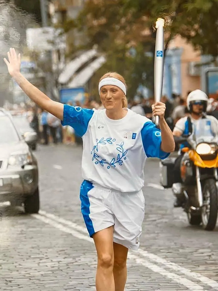 Марина Ткаченко принимает участие в эстафете Олимпийского огня перед Олимпиадой-2004 в Афинах.