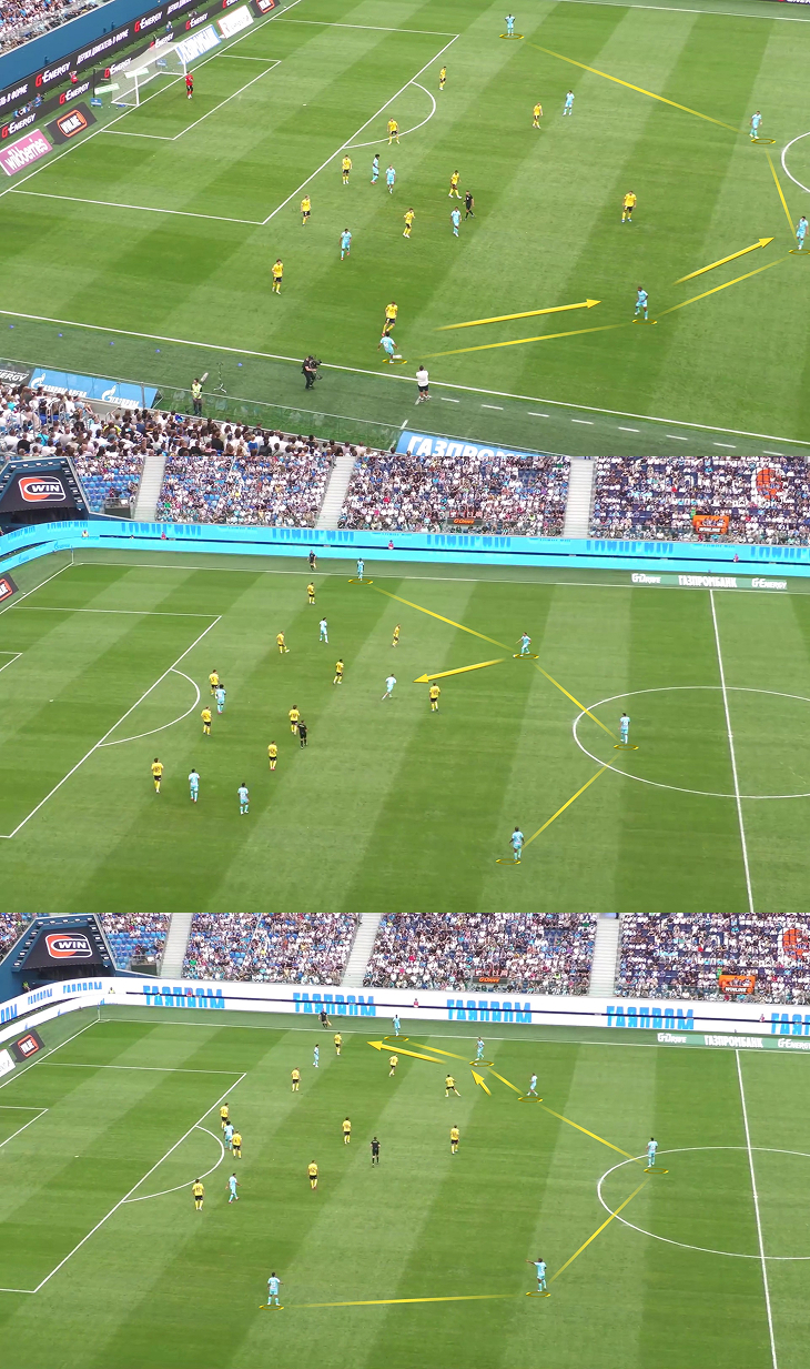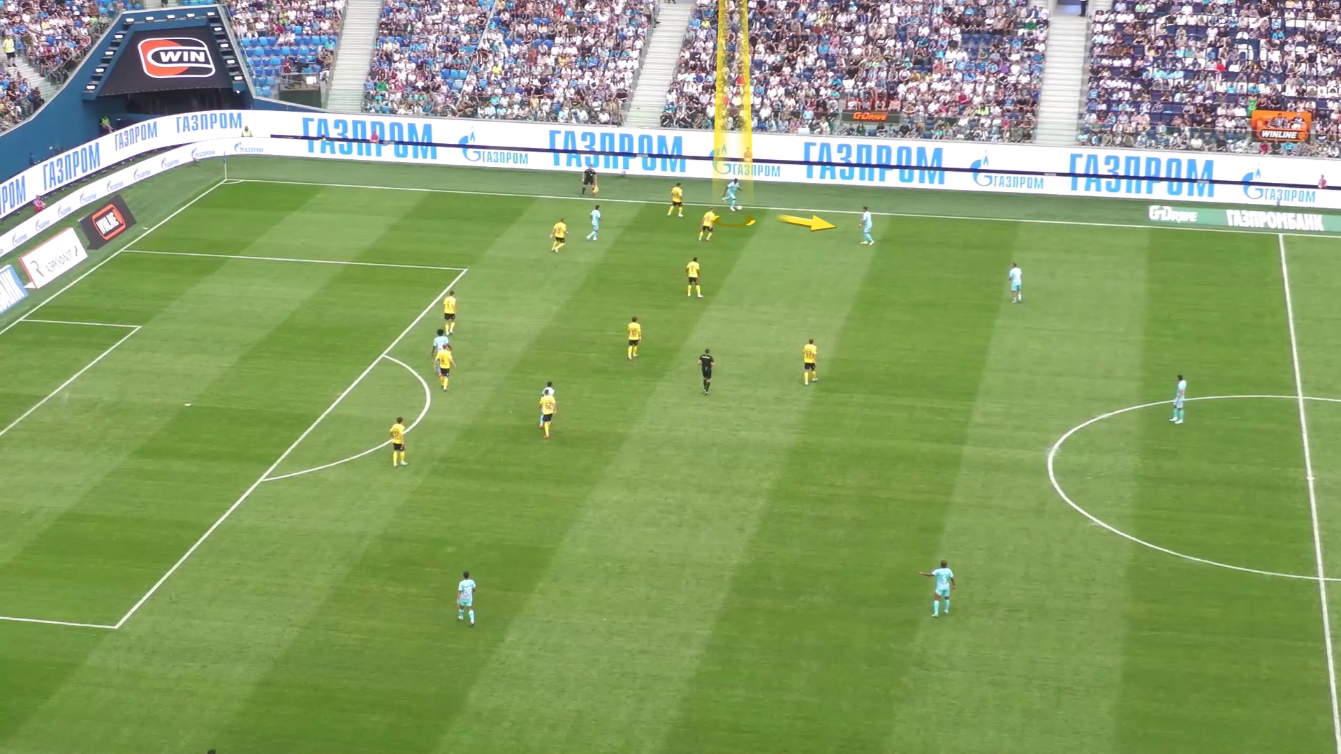 «Зенит» впереди – малоподвижная размашистая парабола, где мяч гуляет с одного фланга на другой и обратно. Минимум проникающей игры на ведении, диагоналей, рывков за спину и разрезающих передач.