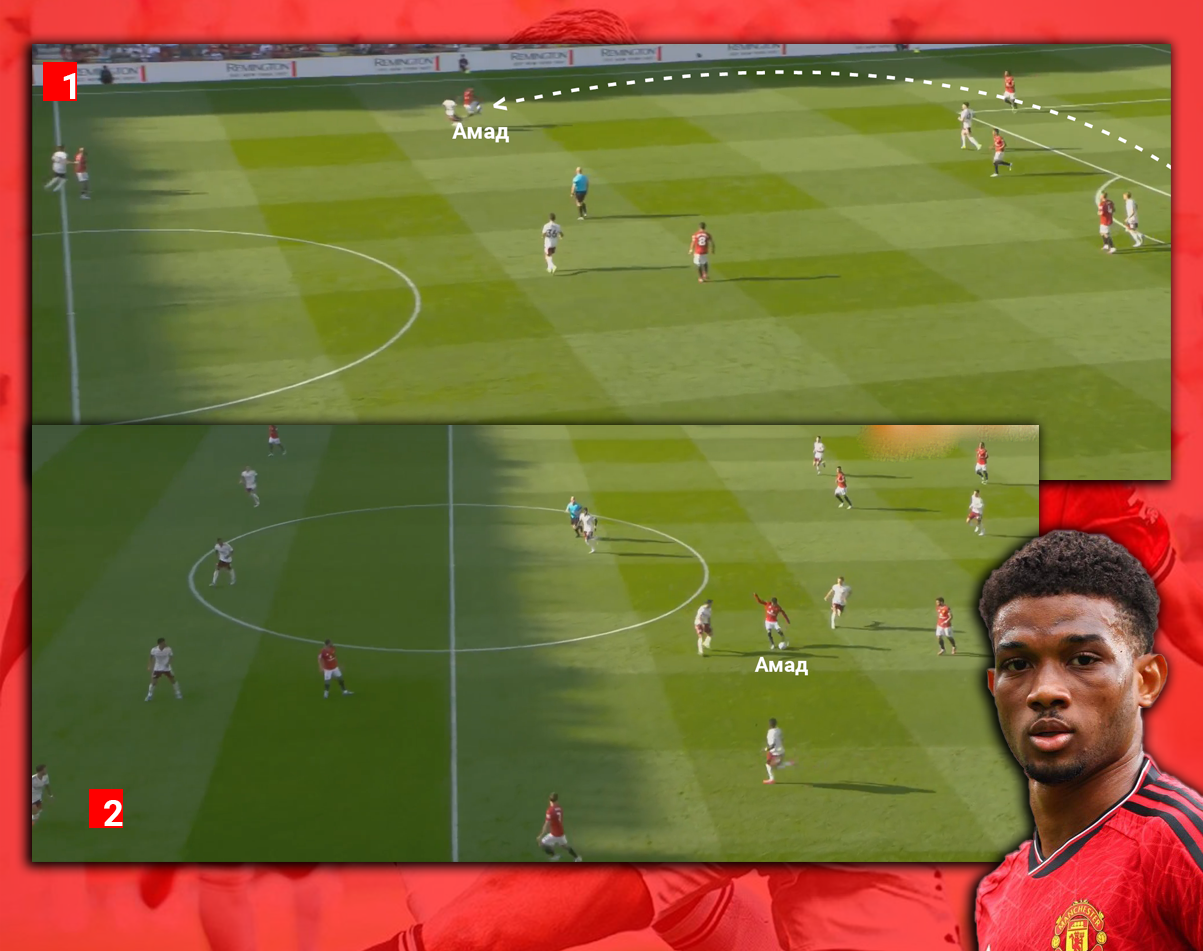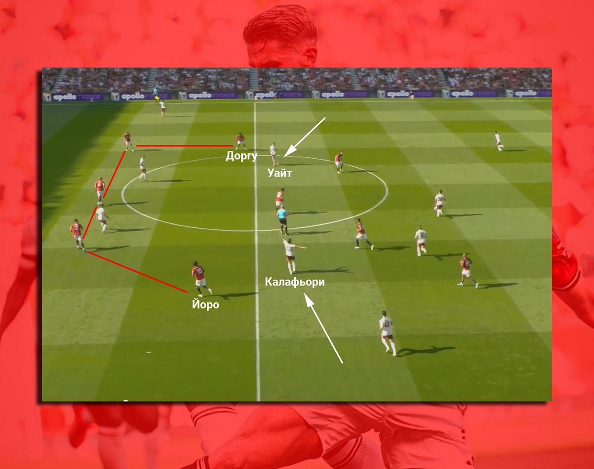 На верхнем скрине вообще очень интересная расстановка «красных дьяволов» — посмотрите как перекосило схему: Йоро и Доргу играют по ложным фуллбекам Уайту и Калафьори, а Далот правый латераль страхует Лени. Это не просто статичная схема 3-4-1-2 из фифы, это динамичная структура в стиле Аморима, где до игроков стали лучше доходить инструкции тренерского штаба