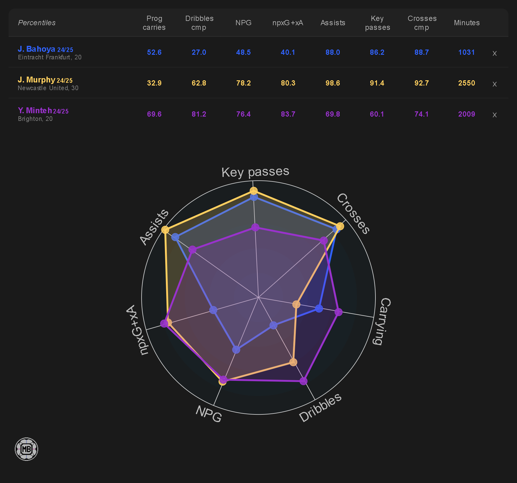Неожиданный пик, но мне очень интересен этот француз. Не имеет крутой статистики, хотя и когда играл на родной позиции, делал 1 результативное действие каждые 110 минут — неплохо. Но что выделяет его — вклад в защитные действия: отборы, прессинг, возвраты владения — всё это несвойственно для молодых игроков. К тому же, у него нереальная скорость (уже рекорд лиги).