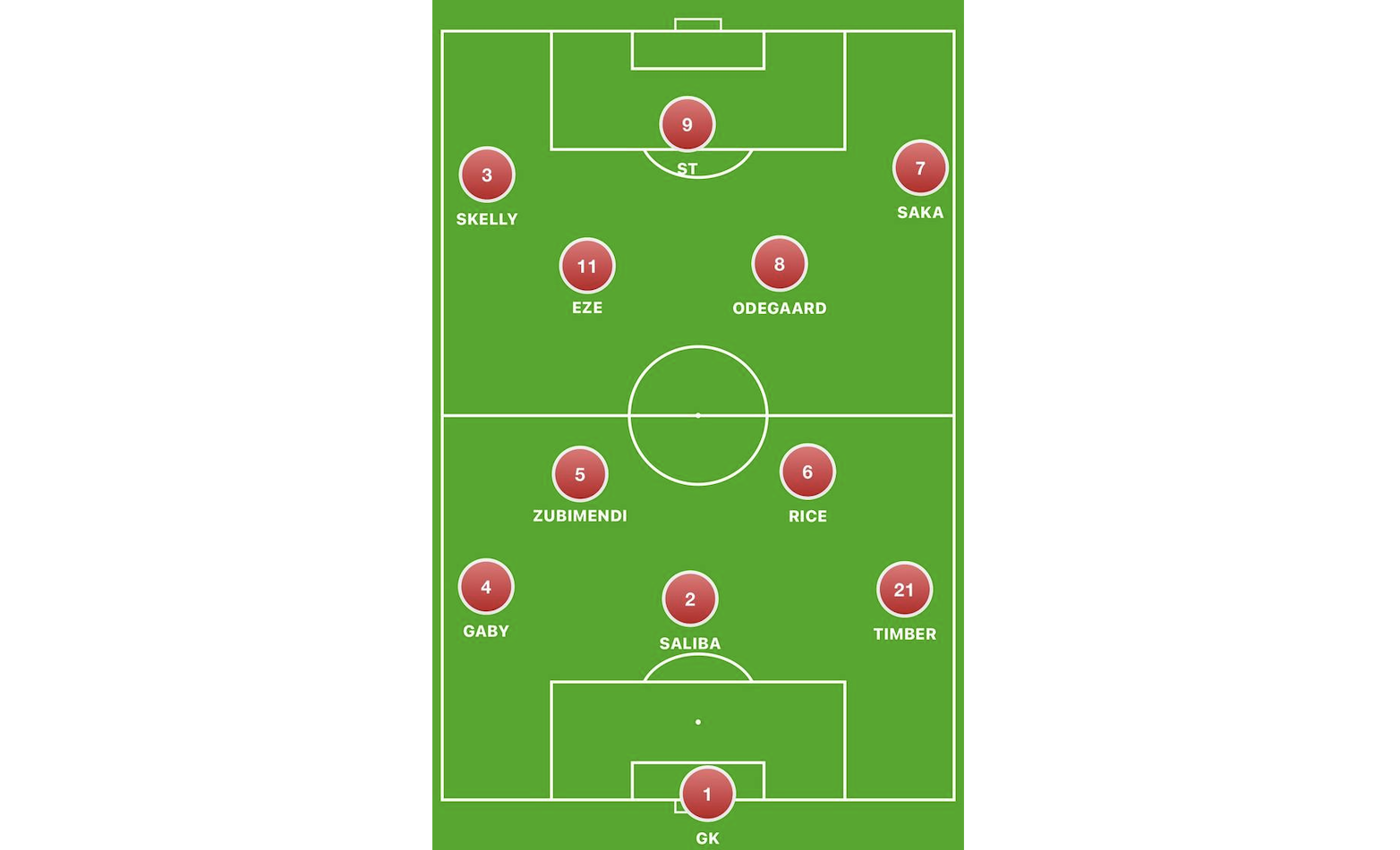 При такой расстановке будет баланс обороны и атаки, где Деклан Райс занимается своим делом (выполнение функций «восьмерки», поддерживая оборону и созидание). Зубеменди ниже, Эдегор и Эзе отвечают за созидание в центре и полуфлангах, особенная роль у Майлза Луис-Скелли (по факту левый крайний полузащитник).