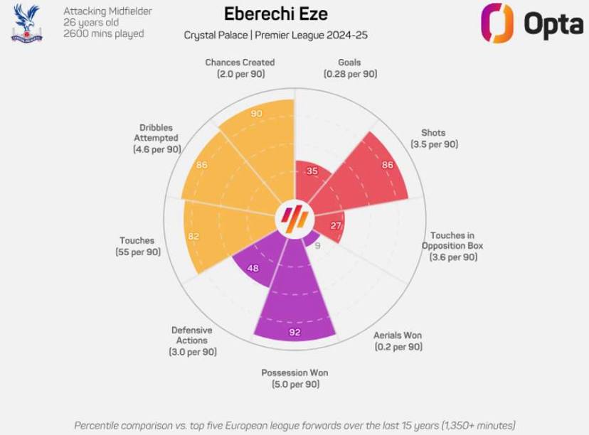 Эзе активен в атаке. За прошлый сезон АПЛ забил 8 мячей (больше только у Хаверца - у него 9 мячей, по 8 у Троссарда и Мартинелли). Отдал 8 голевых передач в АПЛ (больше только у Сака - 11, по 8 у Троссарда и Эдегора). Это отличная статистика для игрока команды, занявшей 12-место по итогу прошлого сезона.