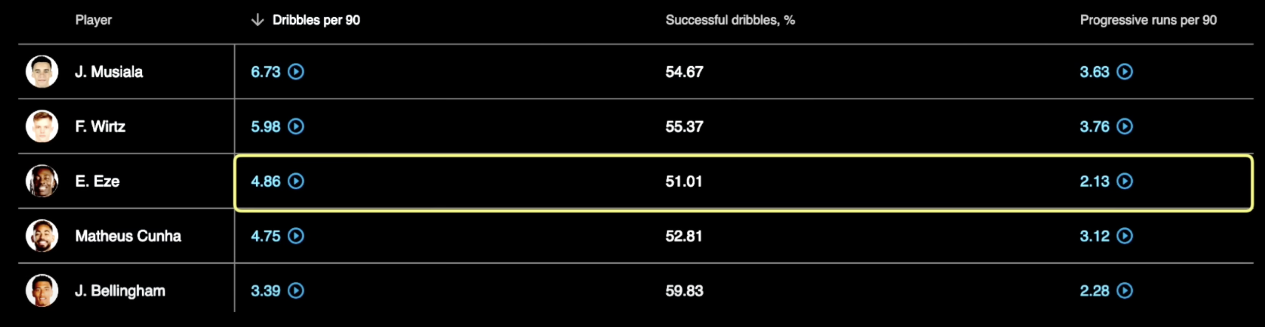 От новичка «Арсенала» ожидают серьезную помощь в борьбе за титул. В прошлом сезоне Эзе показал, что может помочь добыть (аж) два трофея за сезон для среднего по меркам АПЛ клуба. Артете нужны уверенные в себе игроки, которые хотят играть за клуб. И если у него получится встроить правильно Эзе в свой футбол, то лондонцы получат игрока, cпособного разнообразить атаки и усиливать давление на любого соперника.