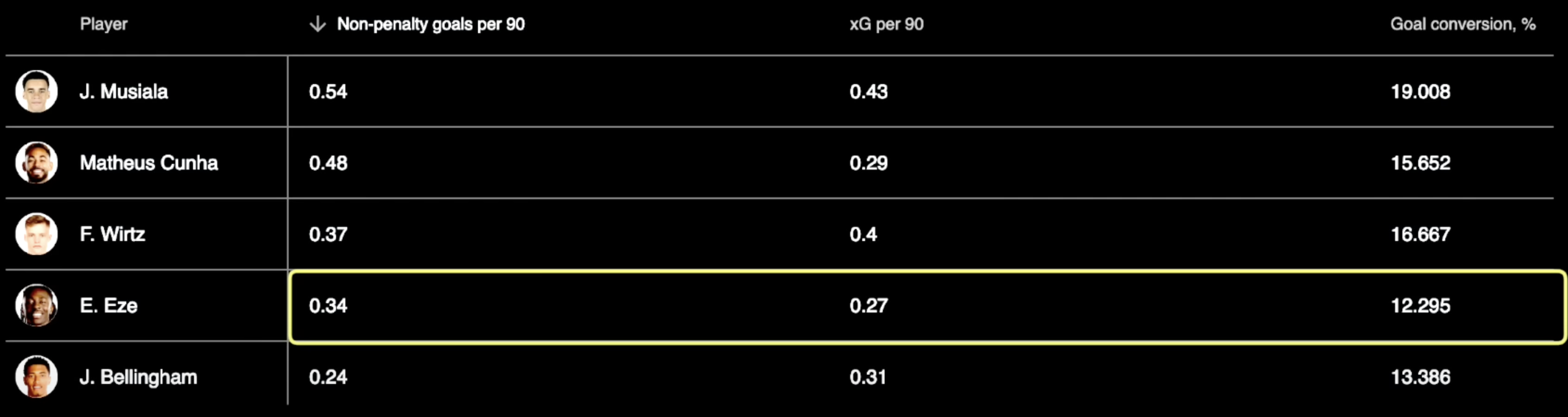 У полузащитников «Арсенала» была одна особенность - они не забивали. Вообще, у команды Микеля Артеты в прошлом сезоне не было игрока, забившего 10 мячей в прошлом сезоне АПЛ (!). При этом заняли второе место. Для голов в первую очередь купили Виктор Дьёкереша. Но и Эзе тоже обладает голевым чутьем.