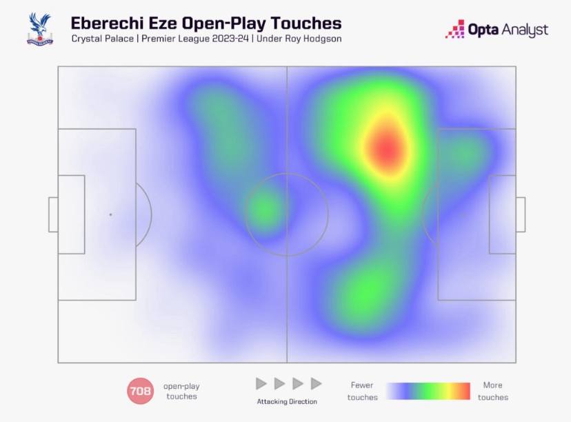 В последнем сезоне в «Кристал Пэлас» Эзе играл левую «десятку». Продвигаясь к зоне, отмеченной красным цветом Эберечи мог дать передачу набегающему по краю латералю, забегающему за спины защитников форварду или пробить самому. Навыки плеймейкера могут разгрузить задачи по построению атаки с Мартина Эдегора.