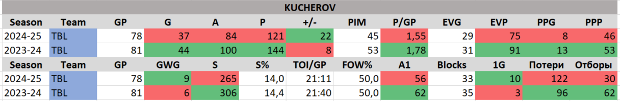 Статистика Кучерова просела, но случилось это после аномально результативного сезона 2023-24. В сезоне 2022-23 сезоне показатели Кучерова были 30+83 (113 очков). Если смотреть на остальные цифры того сезона, 2022-23, то они сопоставимы с прошедшим. Разница незначительна и можно в табличку не добавлять. Просто поверьте, ну или сравните сами.