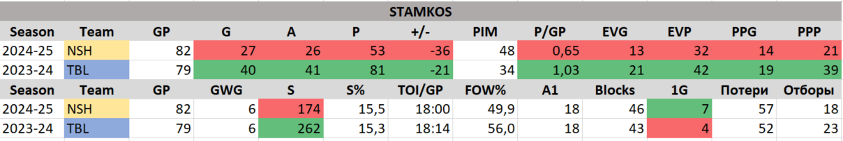 Можно ли сказать, что Стэмкос провалил сезон? Учитывая кэпхит, пожалуй, можно, но стоит сделать оговорку. Провалила сезон вся команда. Никто из звёздных новичков «Предаторс» не сыграл в свою силу, никто из тех, кто уже был в команде и имел звёздный или околозвёздный статус, не подтвердил его на 100 % за исключением Форсберга, да и тот в полезности добрался почти к -30.