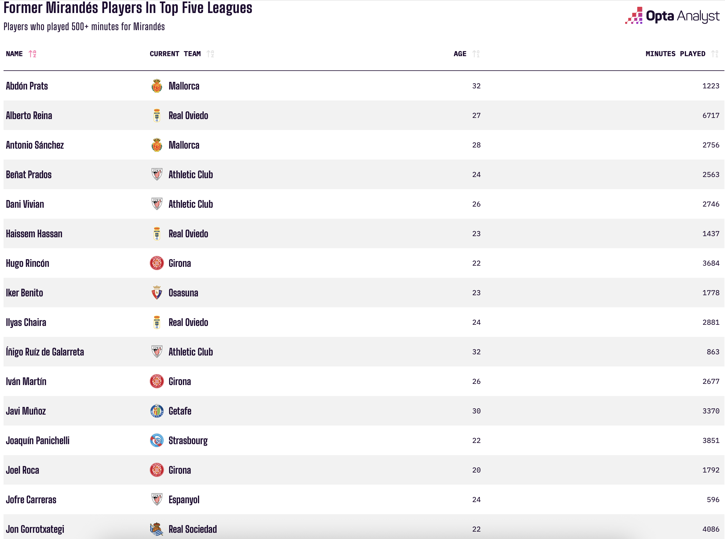 У «Мирандеса» нет своей академии в привычном смысле — зато есть соседство с лучшими академиями страны. «Атлетик», «Реал Сосьедад», «Осасуна», «Алавес» — все они ежегодно выпускают десятки молодых игроков, которых пока рано пускать в основу, но которые переросли уровень дубля. Для них нужна платформа. И «Мирандес» превратился именно в такую — в натуральную внешнюю академию для всей футбольной севера Испании.