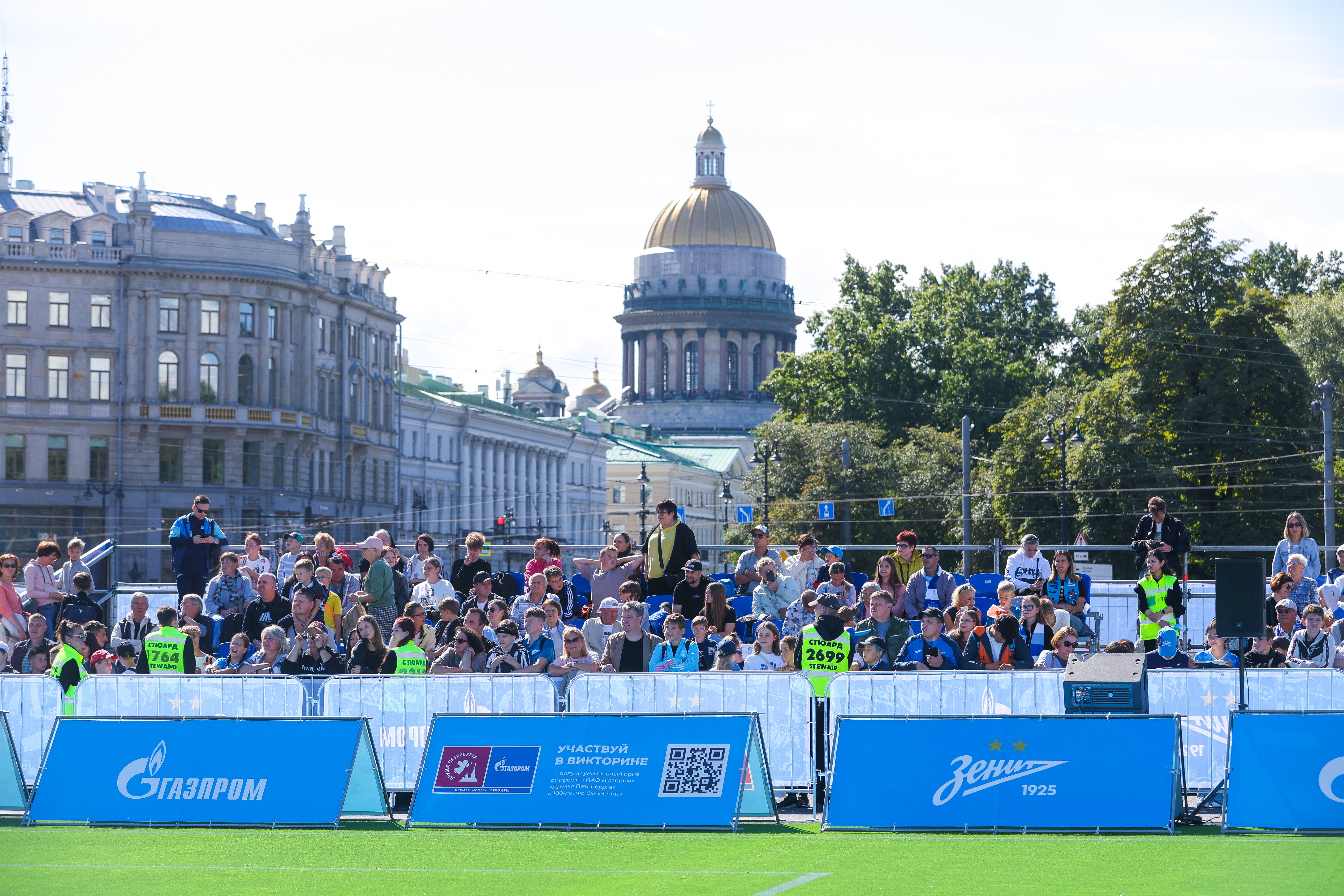 Разговаривали мы уже рядом с полем или вернее мини-стадионом, который словно из-под земли (вернее брусчатки) «вырос» на Дворцовой к фестивалю. Трибуны (причем уже где-то с часа дня полные), зеленый газон, ворота, разметка – все по-настоящему. Первым здесь появился «Зенит-2». При этом выплеск эмоции у парней из Академии «Зенита» сходу оказался не менее мощным, чем у трибун.