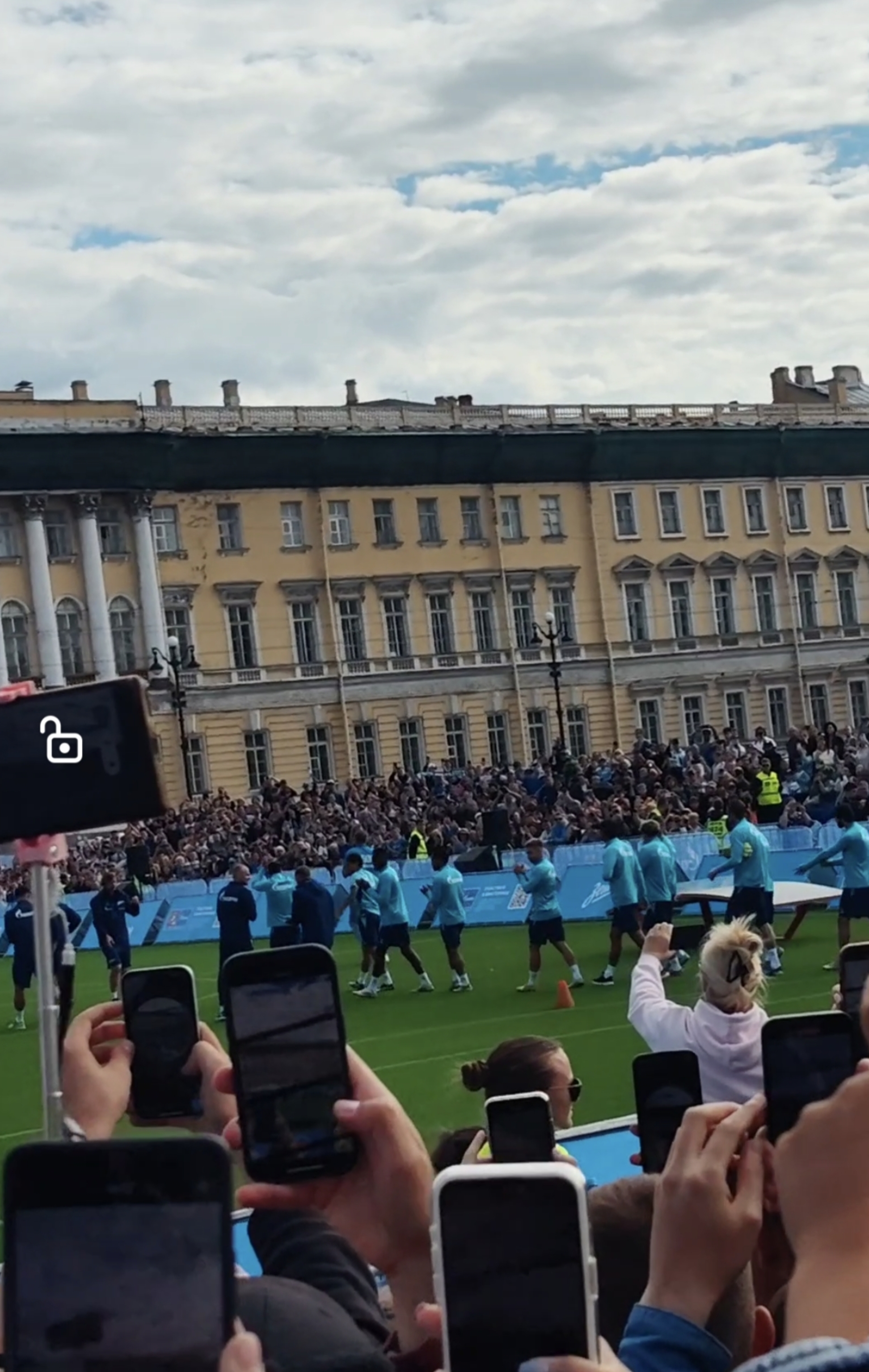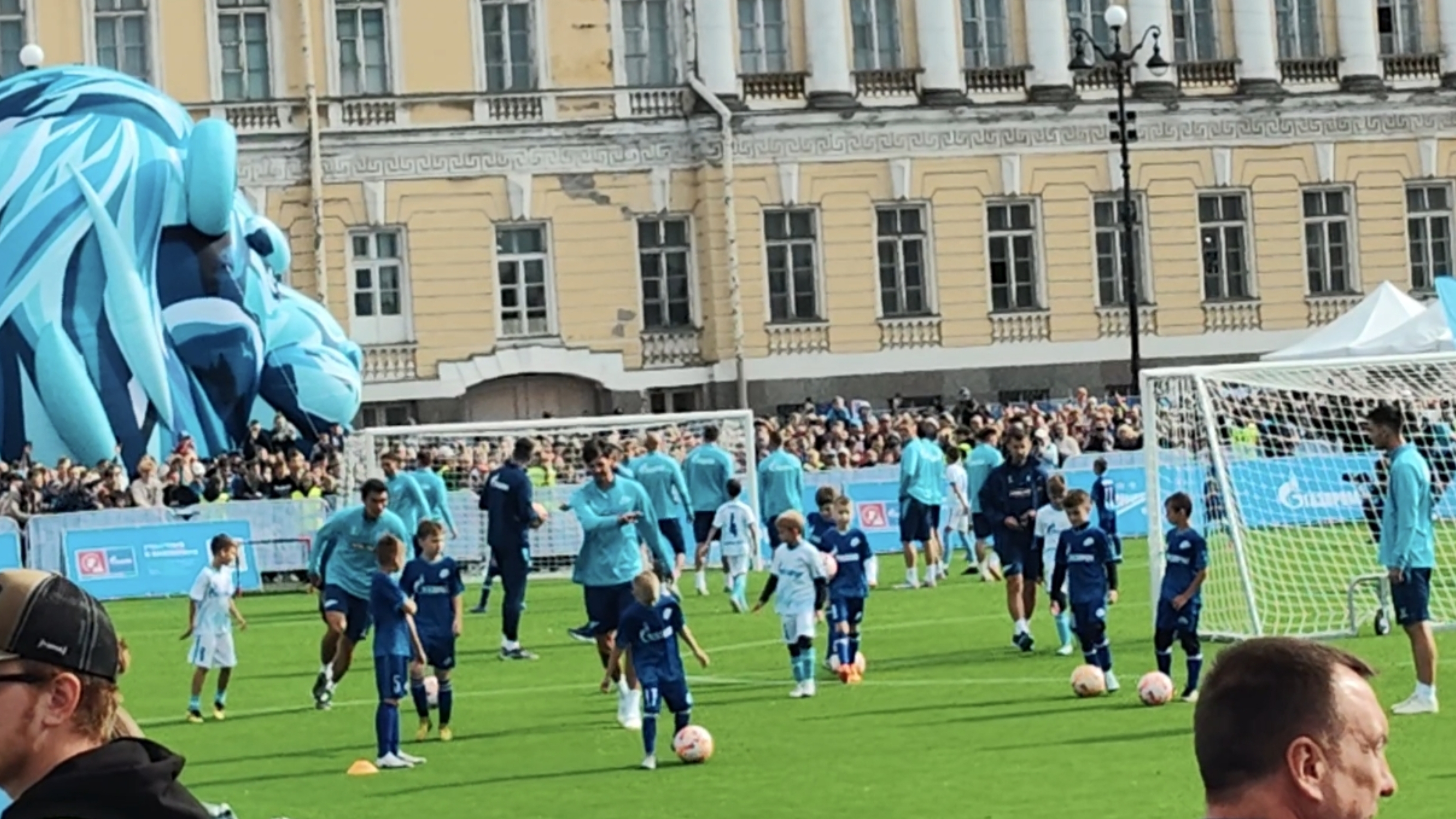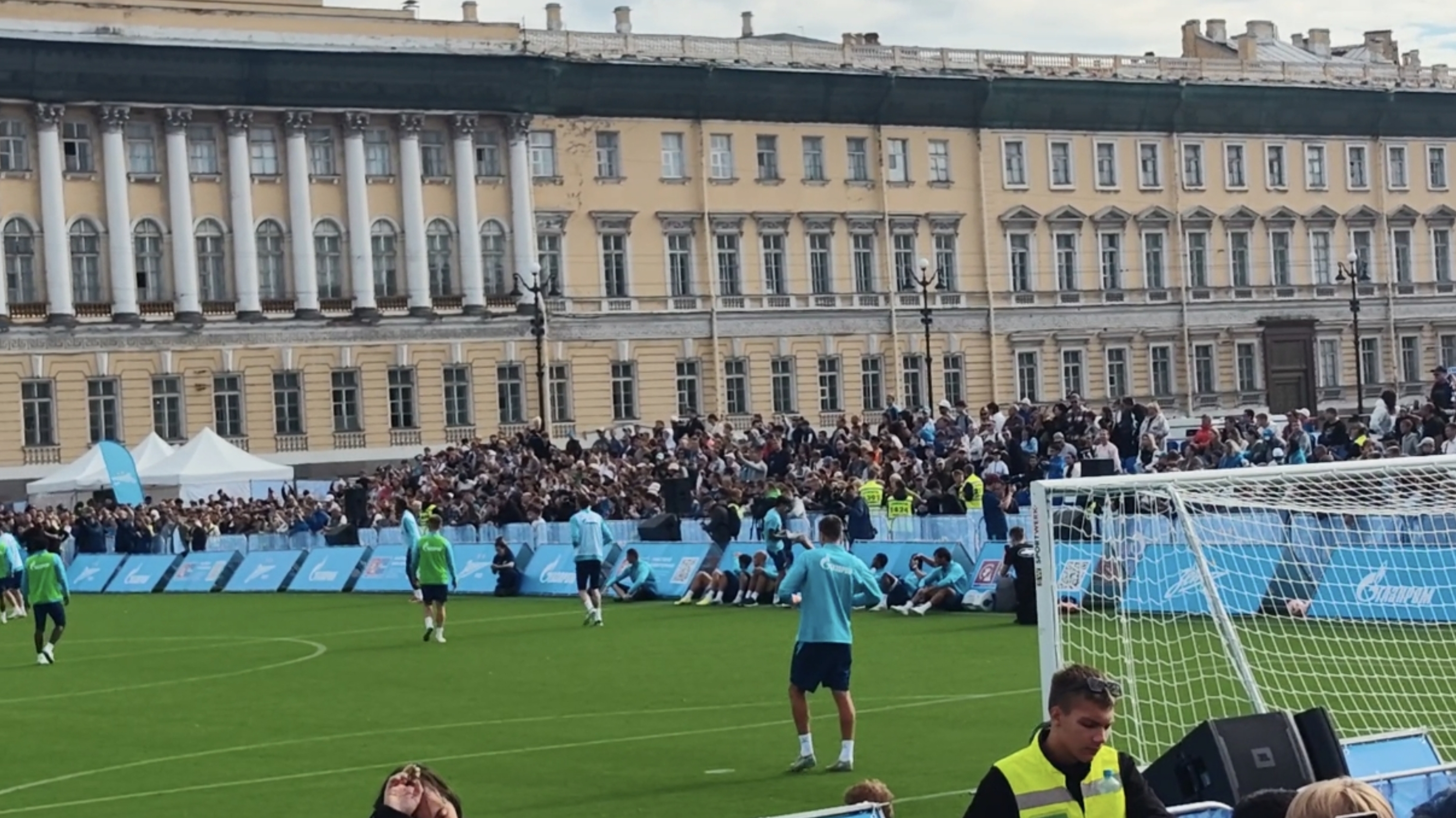 Пришёл я ближе к тренировке основы, потому что до продержаться с 12:00 до 20:00 — задачка не из лёгких, но самые главные моменты я запечатлел в своей памяти и своём телефоне. Первым делом я пошёл к полю, располагавшемуся напротив Зимнего Дворца (не самая привычная локация для игры в футбол) там около 30 минут ждал выхода основы на поляну. Ведущий подбадривал петербуржцев во время ожидания, и каждый раз, когда он повышал голос все думали, что футболисты вот-вот выйдут на игровую площадку, но несколько раз им пришлось набраться терпения, чтобы всё-таки дождаться кульминации всего мероприятия. И, наконец, момент истины настал. А вот и собственно кадры выхода футболистов к болельщикам.