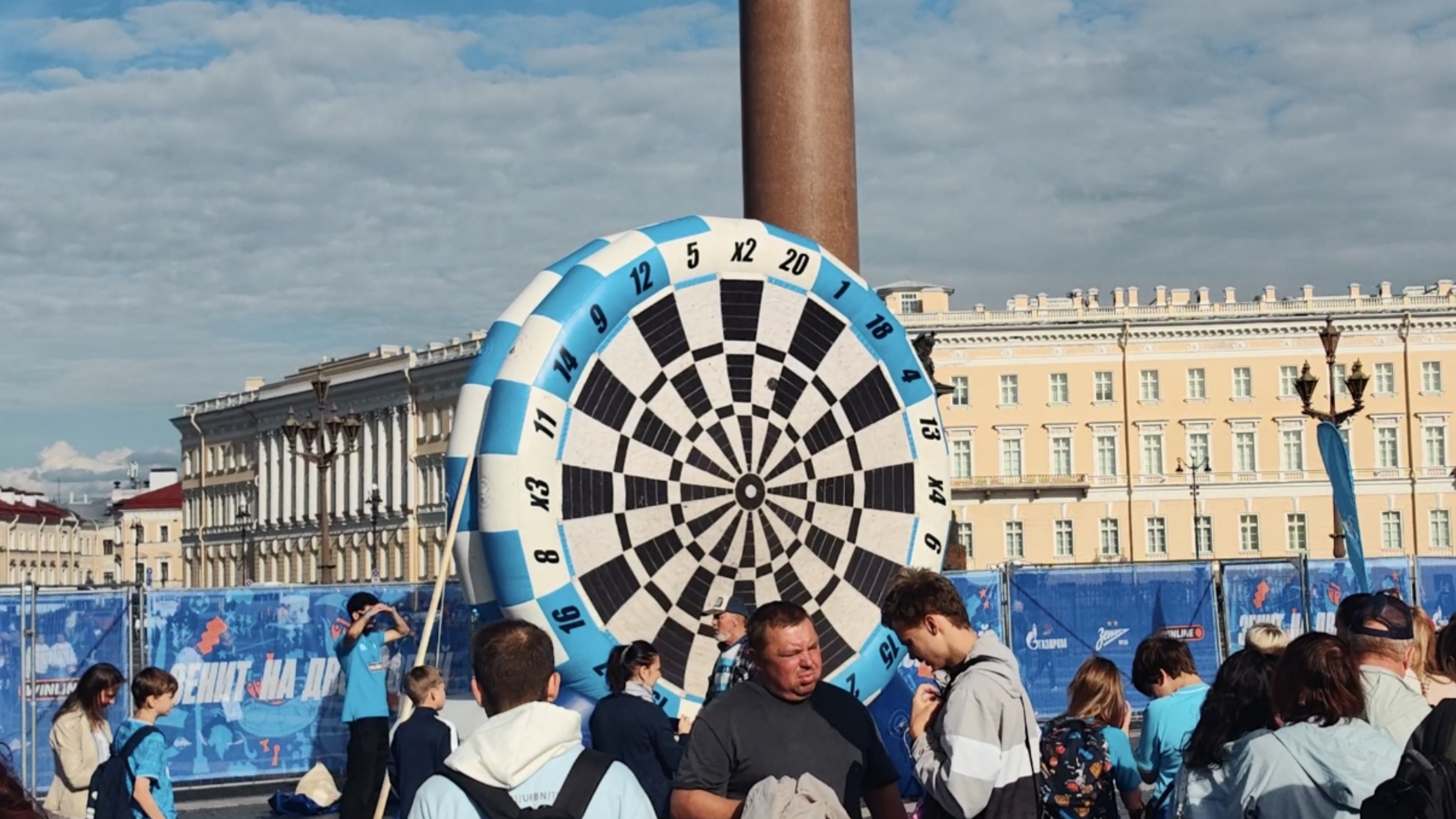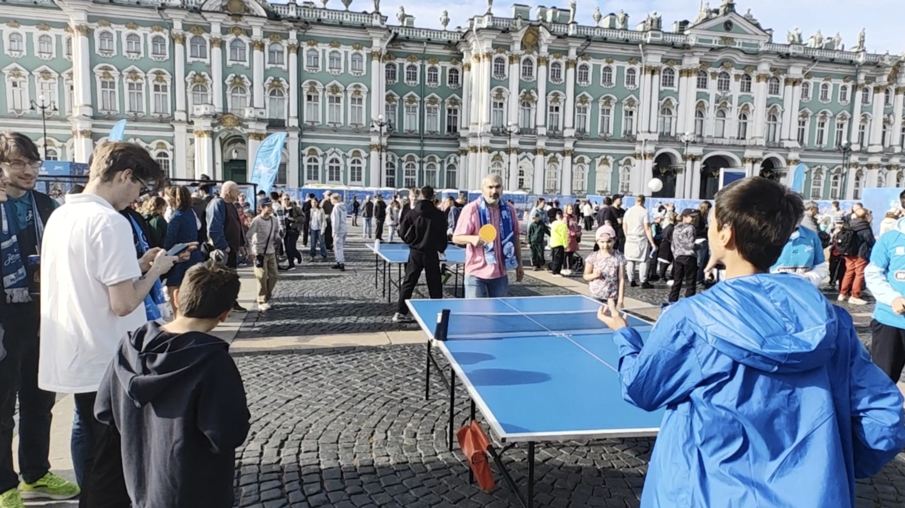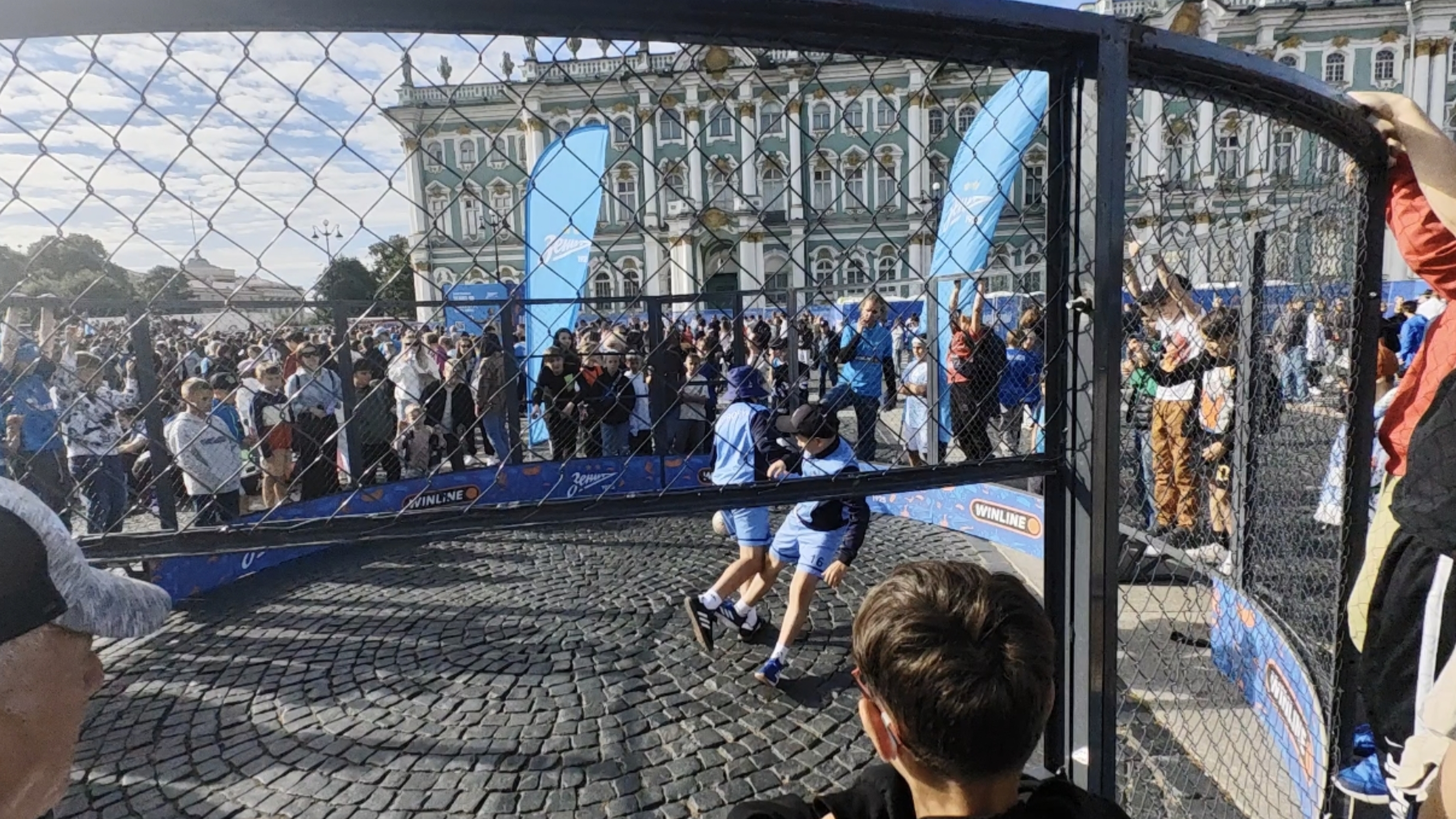 Пришёл я ближе к тренировке основы, потому что до продержаться с 12:00 до 20:00 — задачка не из лёгких, но самые главные моменты я запечатлел в своей памяти и своём телефоне. Первым делом я пошёл к полю, располагавшемуся напротив Зимнего Дворца (не самая привычная локация для игры в футбол) там около 30 минут ждал выхода основы на поляну. Ведущий подбадривал петербуржцев во время ожидания, и каждый раз, когда он повышал голос все думали, что футболисты вот-вот выйдут на игровую площадку, но несколько раз им пришлось набраться терпения, чтобы всё-таки дождаться кульминации всего мероприятия. И, наконец, момент истины настал. А вот и собственно кадры выхода футболистов к болельщикам.