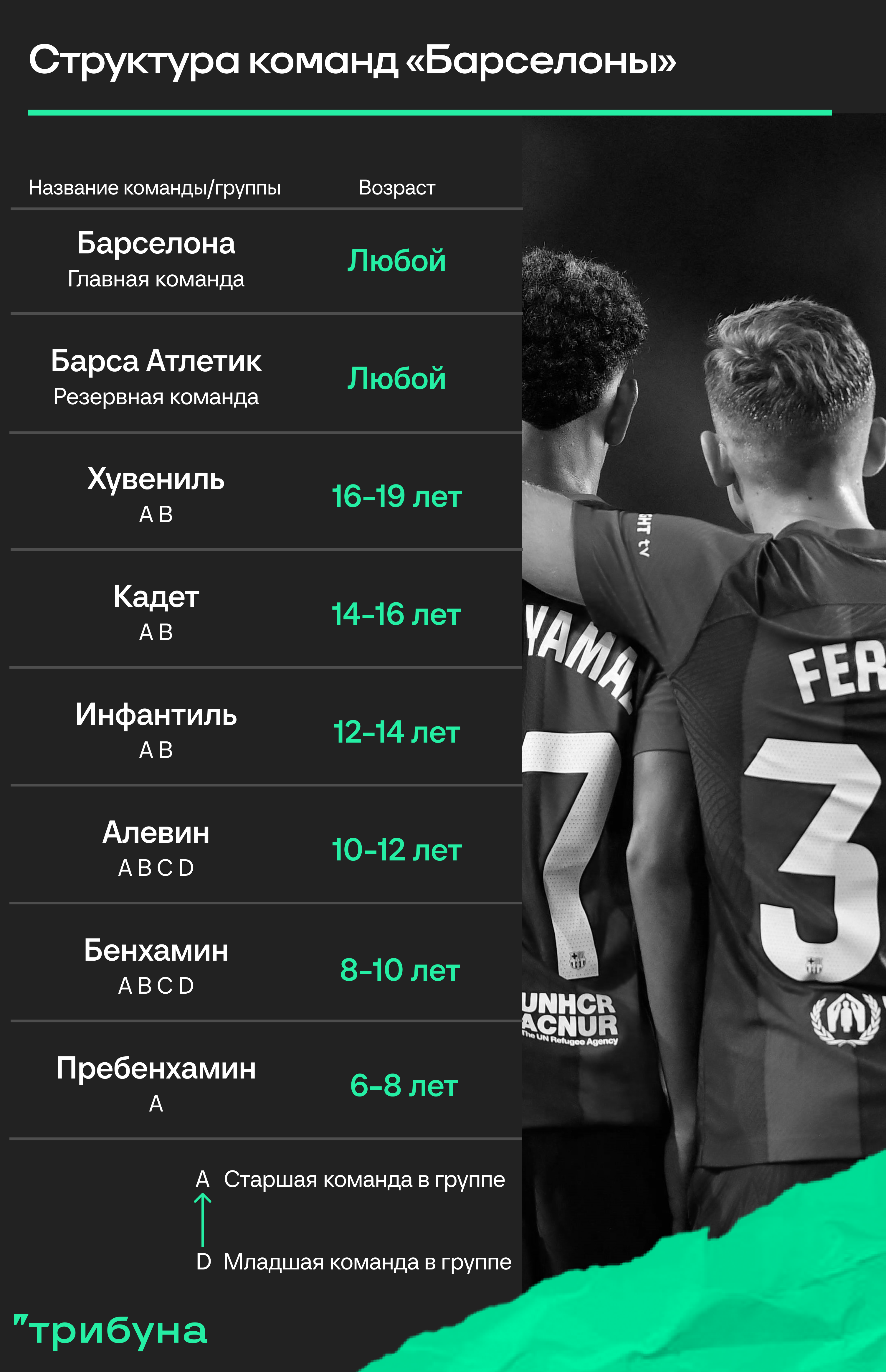 - В тексте будут иногда всплывать странные обозначения молодежных/юношеских команд «Барселоны». Чтобы не запутаться в «Хувенилях», «Кадетах» и прочих испанских названиях – краткий ликбез.