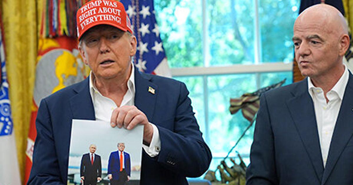 По задумке босса ФИФА главными кадрами этой встречи наверняка должны были стать те, где Трамп держит в руках Кубок мира: он предложил оставить трофей у себя в кабинете, «вон у той стены». В ролике это сразу после сцены с фотографией, если вдруг вы не досмотрели.