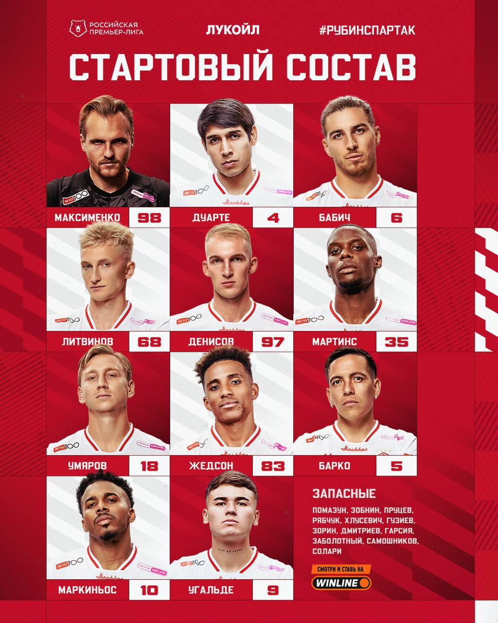 ⚡️Стартовый состав московского «Спартака» на матч против «Рубина»