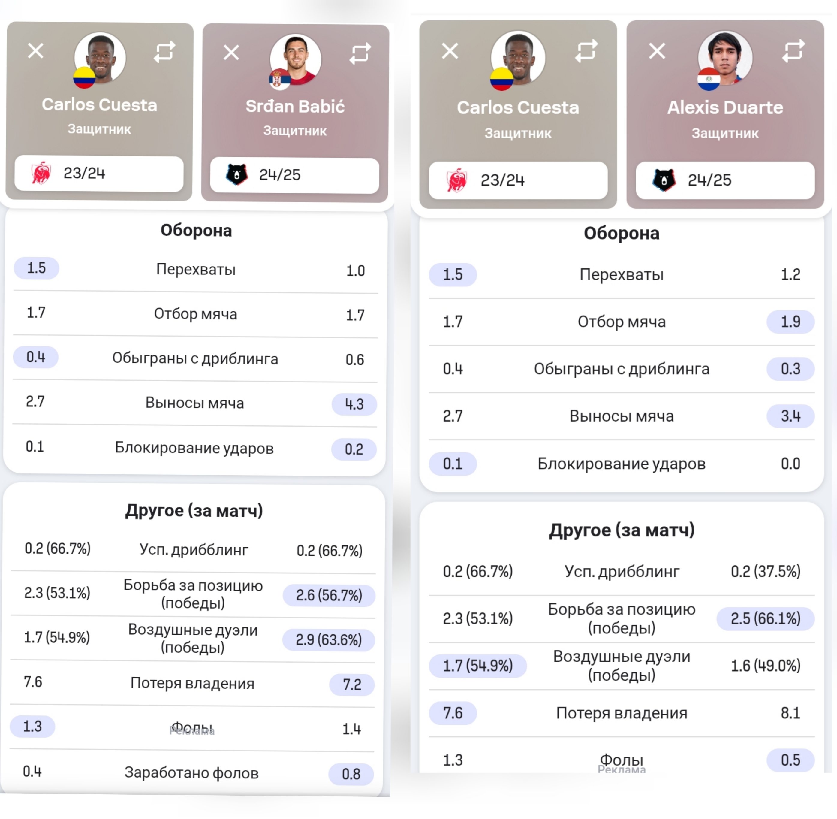 Теперь статистически сравним Куэсту с другими центральными защитниками «Спартака»: Бабичем и Дуарте. Конечно же, делаем ставку на разный уровень чемпионатов Бельгии и России плюс различается манера игры. Тем не менее в сравнении Карлоса с Срджаном можно увидеть, что серб гораздо сильнее на втором этаже, что неудивительно при их разнице в росте, опаснее действует у чужих ворот, а ещё имеет преимущество по среднему количеству выносов, меньше теряет мяч и зарабатывает больше фолов. Зато в активе колумбийца больше перехватов, к тому же его реже обыгрывают, и он не сильно уступает своему будущему напарнику по центру обороны в отборах, заблокированных ударах и ничуть не хуже смотрится в позиционных единоборствах. В сравнении с Дуарте, Куэста опять же чаще перехватывает мяч и, что удивительно, выигрывает больше воздушных дуэлей. В общем, показатели достаточно близкие, но делать какие-то глобальные выводы по ним нельзя, поскольку бельгийская Про-лига значительно отличается от нашей РПЛ и по скоростям, и по количеству борьбы, и по плотности игры.
