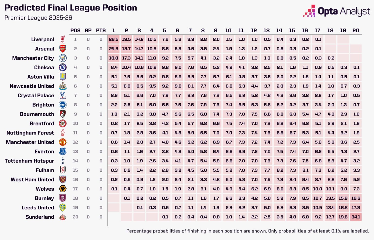 Итак, пришло время к самому интересному. Вот что предсказывает суперкомпьютер Opta на сезон Премьер-лиги 2025/26.