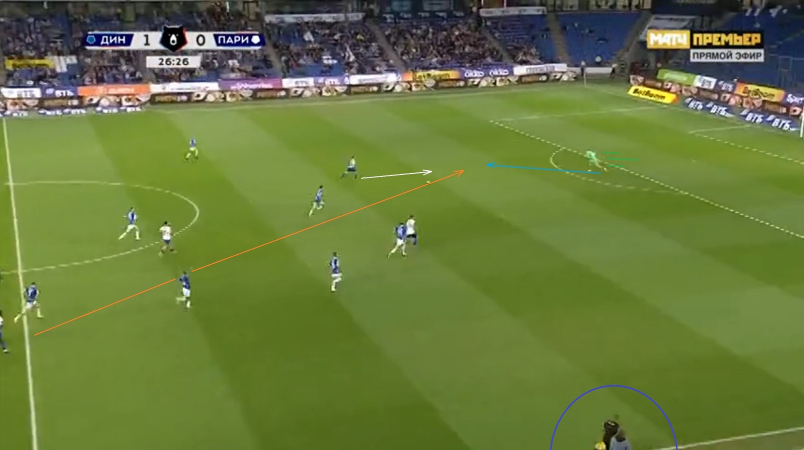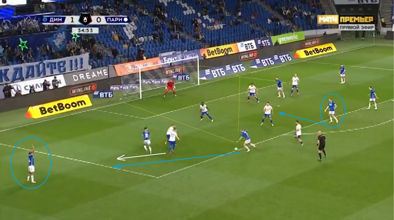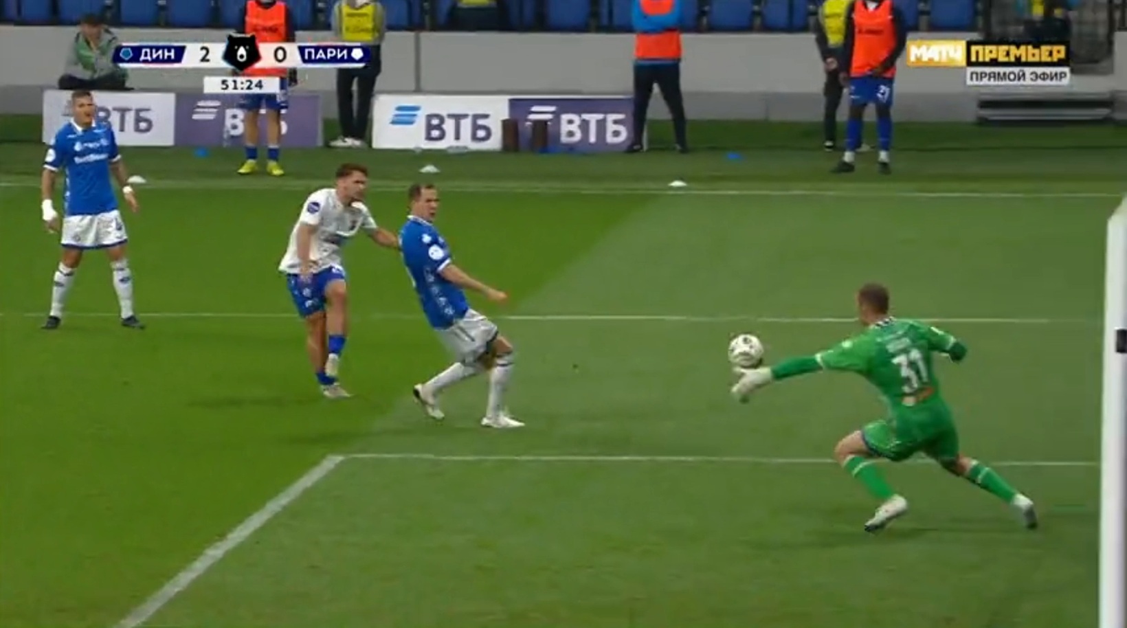 Через пять минут Динамо ответило нестандартной атакой. Казалось бы, Скопинцев потерял темп, уйдя в край (где уже находился Бителло) и уткнувшись в защитника, но там ему никто не помешал навесить на вбежавшего в штрафную Фомина — теперь уже вратарь гостей спасает свои ворота.