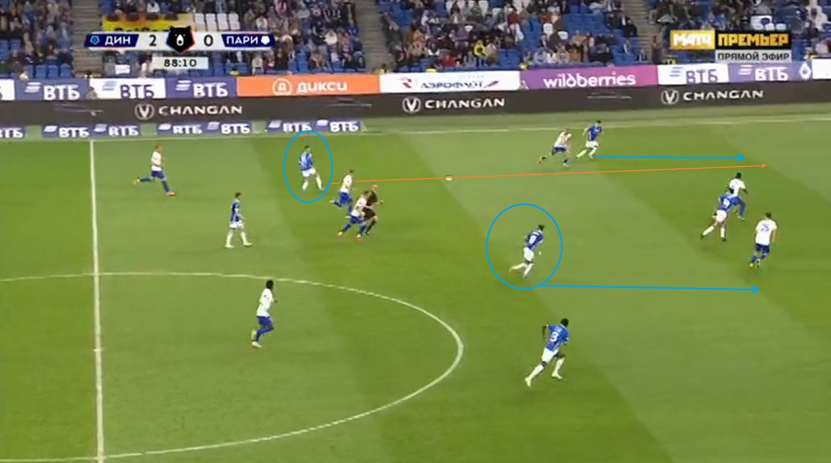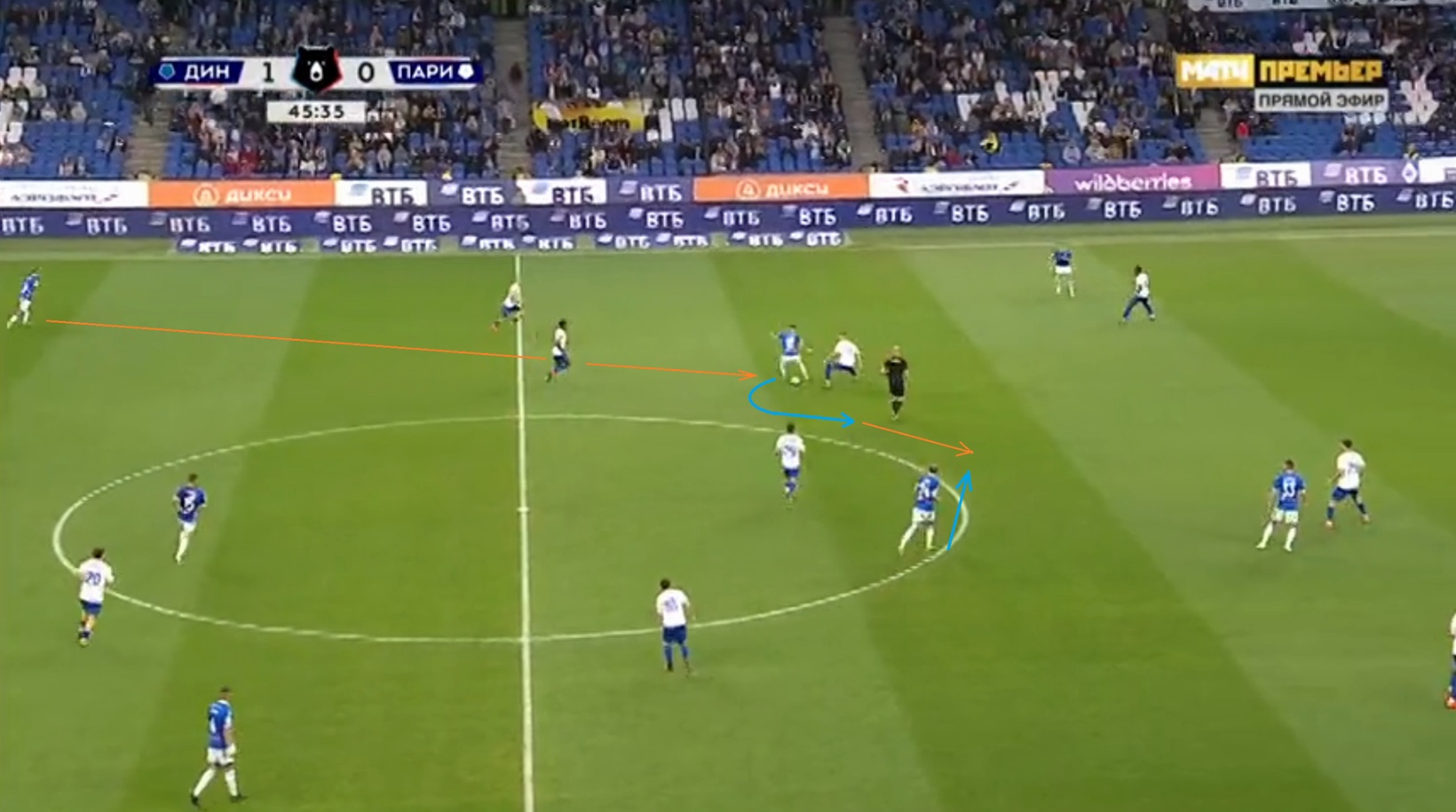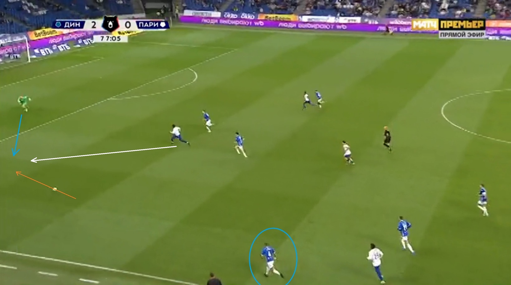 Через пять минут Динамо ответило нестандартной атакой. Казалось бы, Скопинцев потерял темп, уйдя в край (где уже находился Бителло) и уткнувшись в защитника, но там ему никто не помешал навесить на вбежавшего в штрафную Фомина — теперь уже вратарь гостей спасает свои ворота.