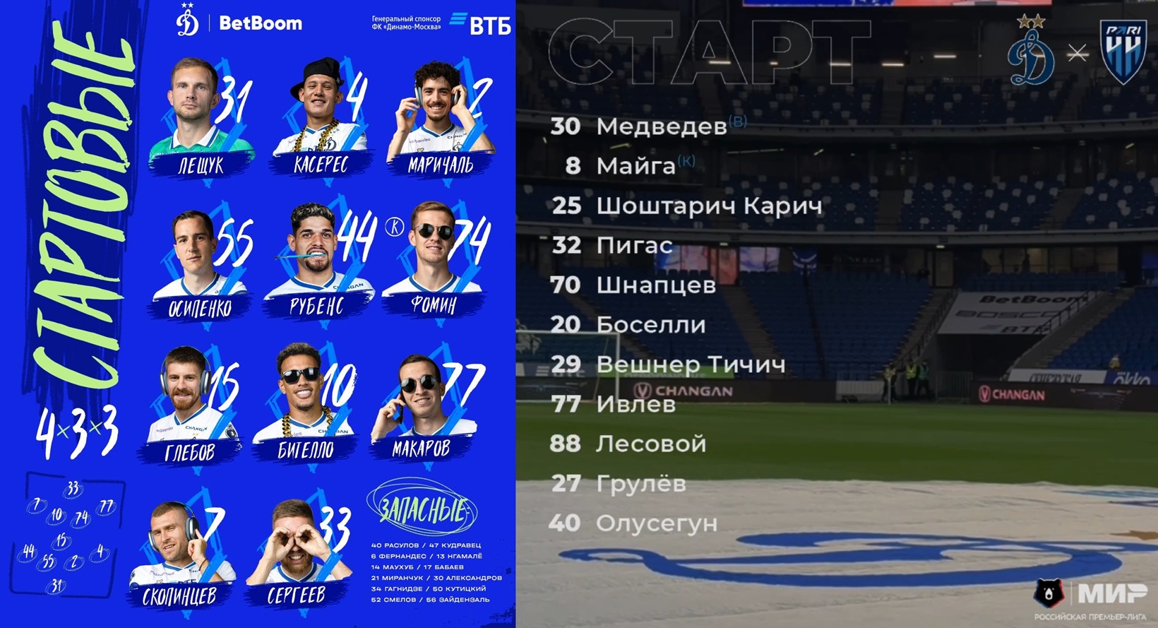 После дерби против ЦСКА в стартовом составе Динамо произошла только одна замена, которая из-за травмы Зайнутдинова выглядела как вынужденная, но давно напрашивалась — слева в атаке вышел Дмитрий Скопинцев. Гораздо интереснее было посмотреть на нашу скамейку запасных. Теперь у тренерского штаба в распоряжении были не только молодые игроки, но и опытные: Фернандес, Нгамалё, Маухуб, Миранчук, Кутицкий. Очень надеюсь скоро увидеть там и фамилию Тюкавина. Состав гостей тоже представлял интерес, так как за нижегородцев выступает сразу три бывших игрока Динамо — Грулёв, Лесовой и Карапузов, правда, последний второй раз в сезоне вообще не попал в заявку своей команды. Дополнительной интриги матчу также добавлял тот факт, что нынешний тренер Пари НН когда-то был в списке кандидатов на пост главного тренера Динамо. Однако вряд ли у команды с берегов Волги были какие-то особые желания кому-то что-то доказывать, так как им нужно выбираться ещё и из более глубокого кризиса, чем у нас — лишь одна победа при четырёх поражениях в РПЛ и предпоследнее место.