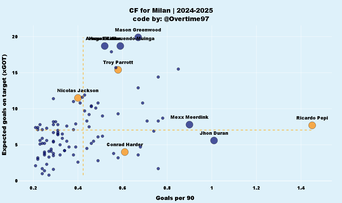 Сейчас, по инсайдам, Хардер очень близок к переходу. И статистика в прошлом сезоне португальского чемпионата у него скромная: 5+5. Однако при пересчёте на 90 минут, датчанин — элитный игрок: шикарные финишинг, дриблинг и игра в подыгрыше, также сильная игра в борьбе. И я думаю, что он был бы качественным дополнением. Если рассмотреть остальные варианты кратко, то Хойлунд и Джексон слишком дороги и не гарантируют результаты. В то же время, Пепи и Пэррот — очень интересные и бюджетные варианты, которые бы усилили ростер «Милана». Но у обоих есть большой минус — слабая игра на втором этаже. В итоге, как минимум Хардер должен прийти в команду.