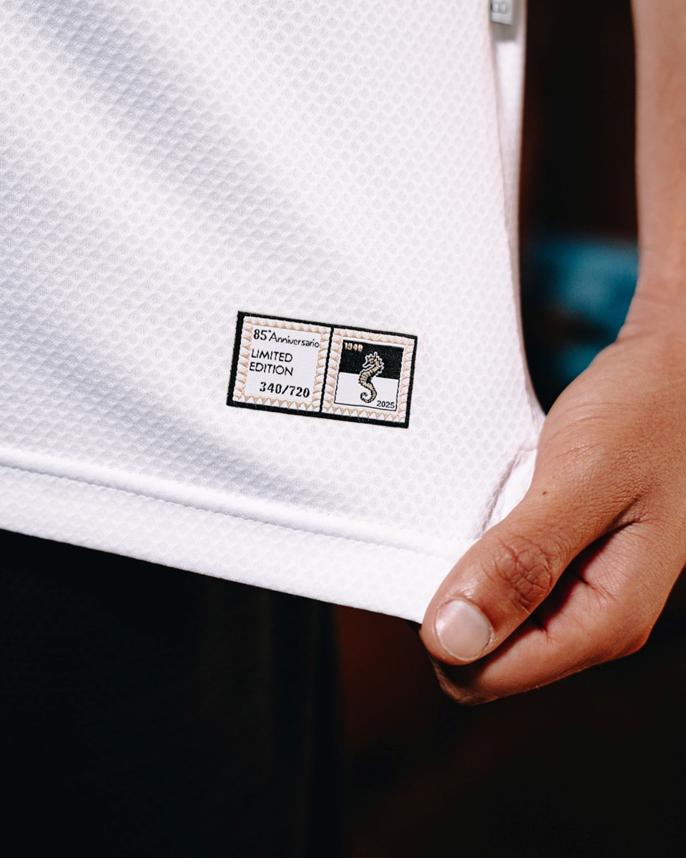 Вместо обычной эмблемы используется фирменный значок, сохраняя черно-белый дизайн с морским коньком, но дополняя его золотой вышивкой и числом 85. Каждый комплект поставляется в специальной коробке с золотыми акцентами и соответствующей графикой в честь годовщины.