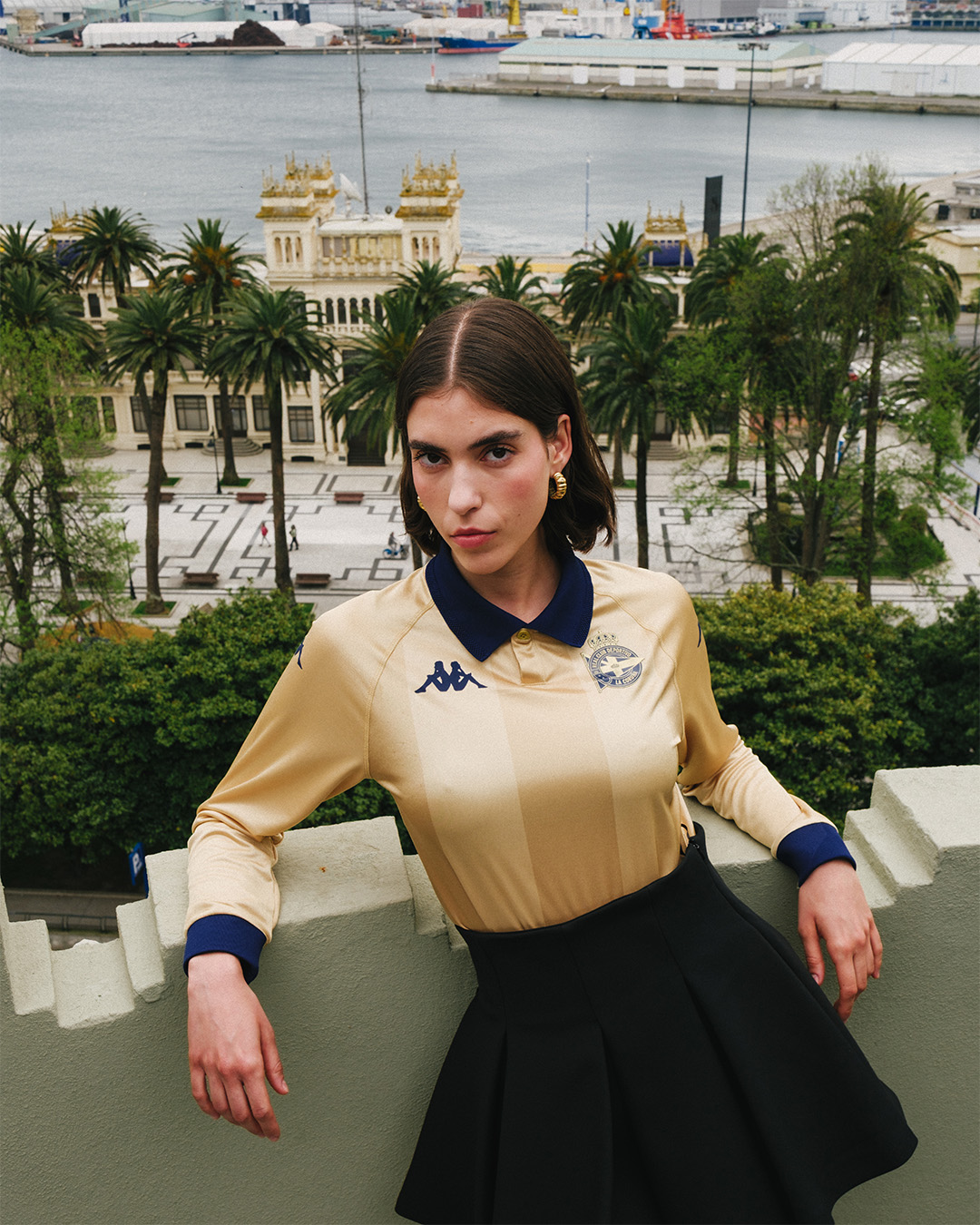 Элегантный воротник-поло и изящный клетчатый рисунок, интегрированный в ткань, добавляет футболке текстуру и глубину. Презентация формы состоялась с помощью проекции на фасаде оперного театра Кампоамор в Овьедо.