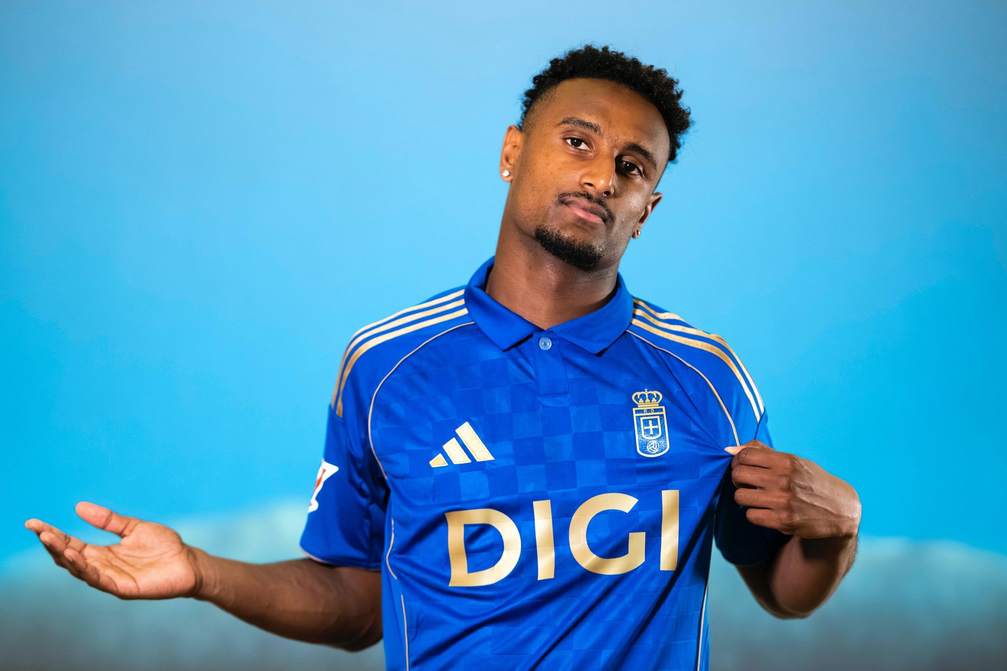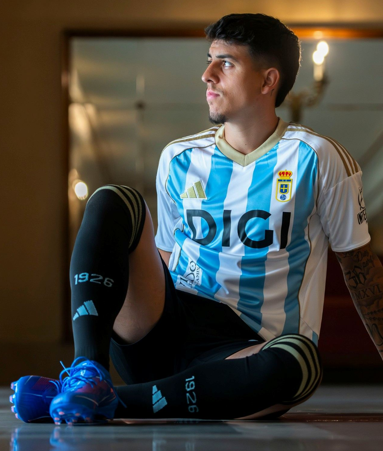 Третья футболка выполнена в более легком стиле «сборной Аргентины» с чередующимися светло-голубыми и белыми полосками, отсылая к эмблеме второго клуба-основателя – «Реал Клуб Депортиво Овьедо».
