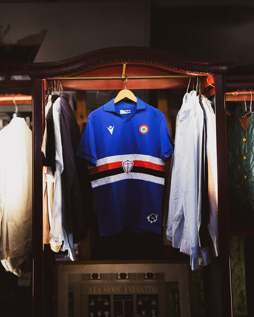Джерси воссоздает дизайн той эпохи: синяя основа с классическими горизонтальными полосами белого, красного и черного цветов, логотипом клуба в центре и трехцветной эмблемой на груди.