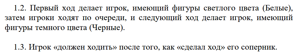 Давайте попробуем копнуть чуть глубже и обратимся к букве закона шахмат. В шахматах игроки делают ходы по очереди. Об этом нам говорят одни из первых статей правил шахмат — статьи 1.2 и 1.3.