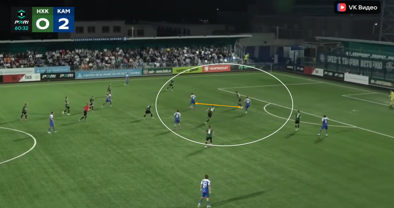 Проблемы возникают разве что с флангами – из-за достаточно активных ролей фулбеков и высоких позиций вингеров «КАМАЗ» не всегда успевает вовремя заполнять пространства, что использует соперник.