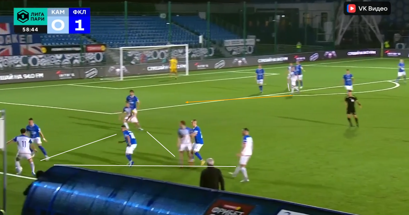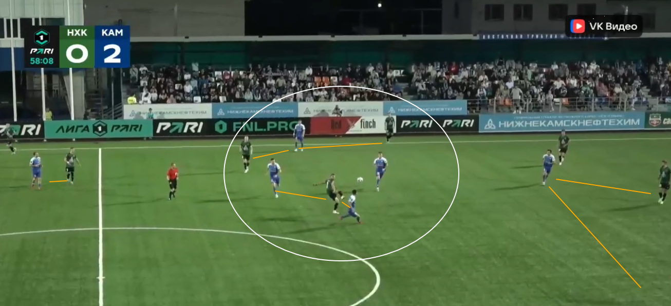 При выходе из обороны клуб из Набережных Челнов использует достаточно современную структуру, которая заточена на более быструю доставку мяча вперед. Построение 2-4-3-1 начинается с владения мячом, так хотят поднять линию прессинга соперника и освободить определенные коридоры. Если не получается, футболисты «КАМАЗа» просто разными способами двигают мяч выше, прижимая соперника.