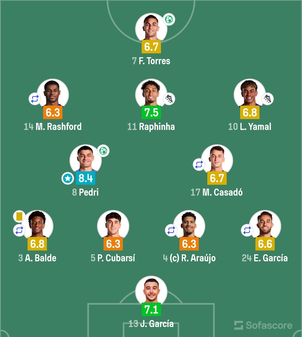 По сравнению с первым туром, в стартовом составе два изменения. Во-первых, Касадо вышел вместо Де Йонга (у голландца родился сын и его не было в заявке, хотя по словам Ханси Флика он был готов к матчу). Касадо не так хорош на мяче и более оборонительный опорник, что не даёт продвигать мяч на таком же уровне, что и с Де Йонгом в составе. Во-вторых, Рэшфорд появился на левом фланге (в прошлом туре там был Рафинья), а сам бразилец был десяткой, сыграв на непривычной для себя позиции.