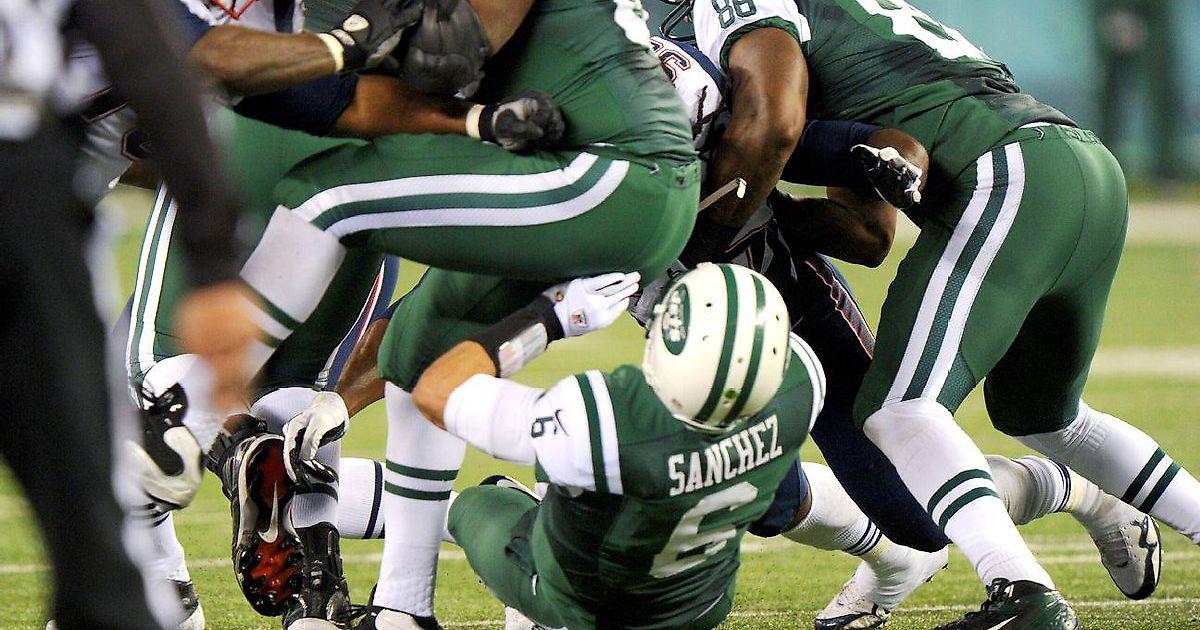 У Братьев Маркс никогда не было такого момента. «Джетс» отставали от «Нью-Ингленд» в ночь Дня Благодарения. Квотербек «Джетс» Марк Санчес принял снэп и повернулся влево, чтобы отдать мяч. К сожалению, Лекс Хиллиард, фуллбек, который должен был принять вкладку, вместо этого повернул направо.
