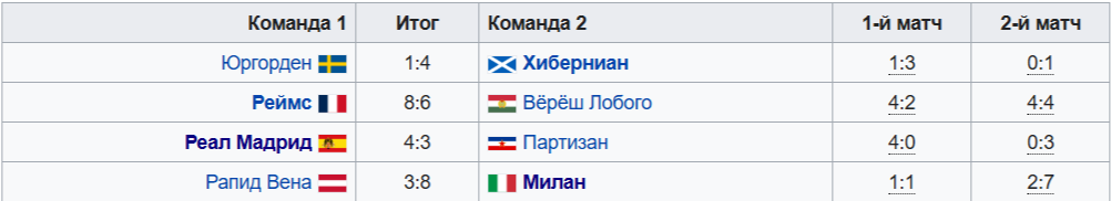 В первом матче на «Сантьяго Бернабеу» в упорной борьбе «Милан» уступил 2:4. Ответный матч на «Сан-Сиро» принес победу «Милану» 2:1, но этого было мало для выхода в финал. На два мяча Джорджо даль Монте, оба кстати забитые с пенальти, Мадрид ответил голом Хосеито.