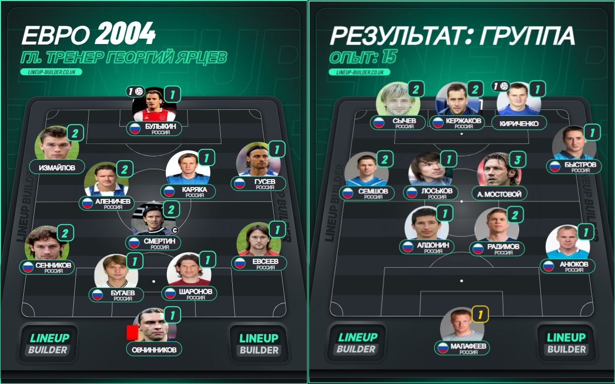 Первое ассоциировалось с легендами 1990-х годов, которые успели поиграть в Европе и мастодонтами российского чемпионата с новыми молодыми талантами. Карпин, Мостовой, Онопко, Смертин, Аленичев - «европейцы». Титов, Овчинников, Лоськов, Семшов - опытные лидеры РПЛ. Новые таланты на годы вперед - Сычев, Аршавин, Кержаков, Быстров, Анюков.