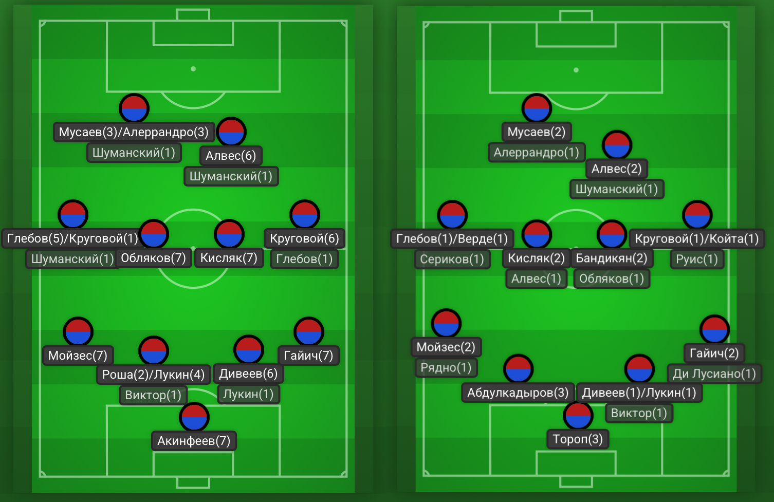 Фабио Челестини остановился на схеме 4-4-2 при обороне и 4-2-3-1 при атаке. Из-за ухода Роши центр обороны неоднократно ротировался на старте сезона. На составе сказалась и травма Шуманского, который очень нравится Фабио своими уходами в центр, хорошим дриблингом и ударом. Челестини попробовал обоих центральных нападающих, но их игра откровенно не впечатлила, поэтому ждём трансфер на эту позицию. Остальные же игроки играли без замен из-за короткой скамейки. Отдельно стоит отметить великолепную адаптацию Матеуса Алвеса, который плотно обосновался в старте. Интересную позицию Фабио нашел для Кругового. Данил теперь успешно играет правого нападающего и приносит огромную пользу команде. Из летних новичков совсем мало играет Верде, пока аргентинец выглядит инородным телом.