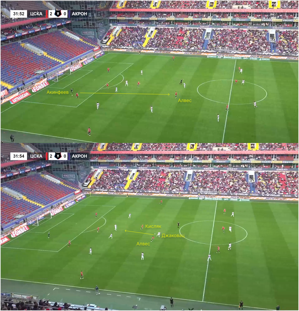 ЦСКА высоко прессингует и кренится в атаку, из-за чего не всегда готов к потере мяча. Транжирство в духе «Динамо» Лички тоже негативно влияет на баланс. Стремление смело разыгрывать через середину иногда приводит к обратной угрозе. Например, так привезли штрафной, с которого забил «Акрон».