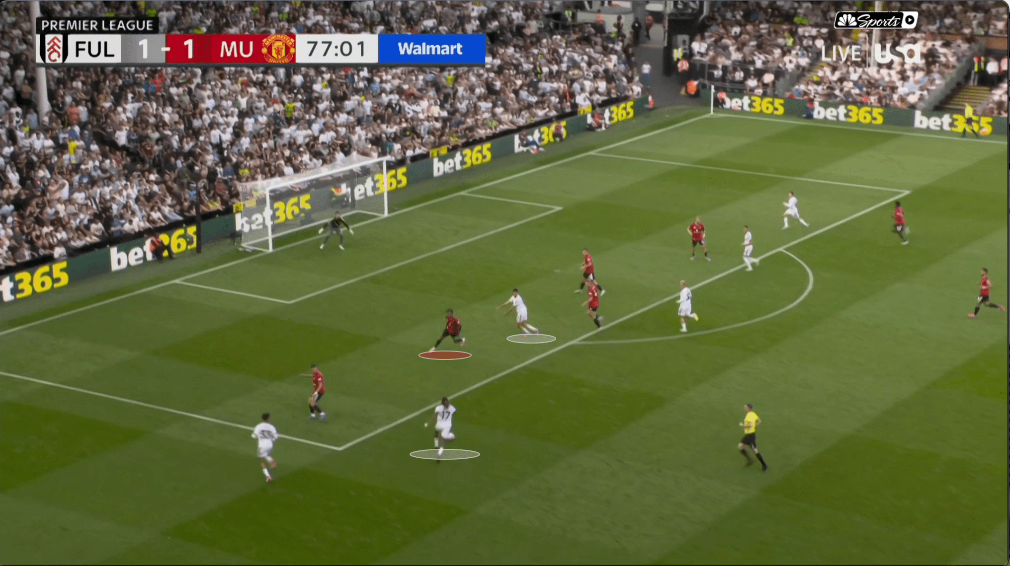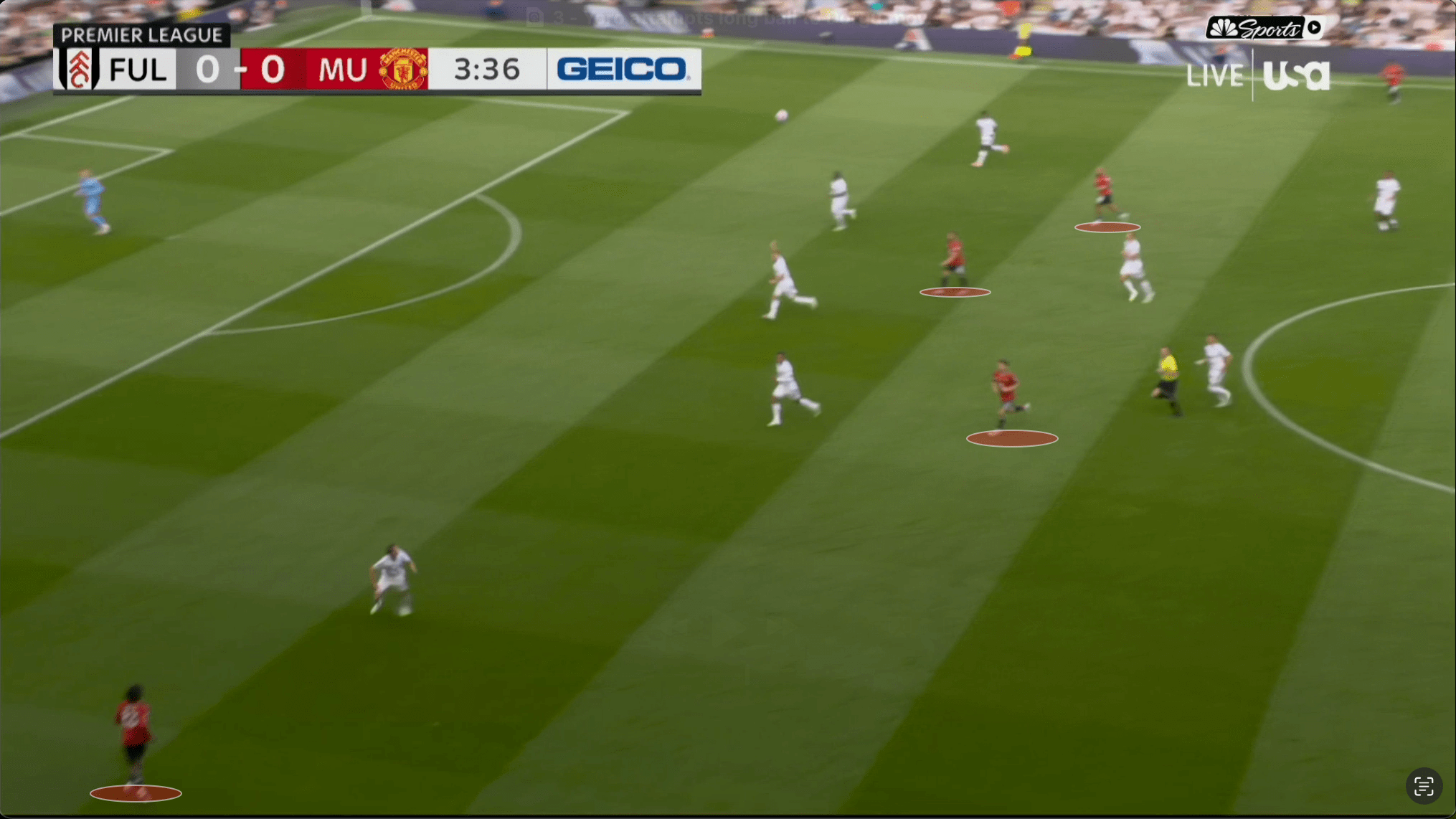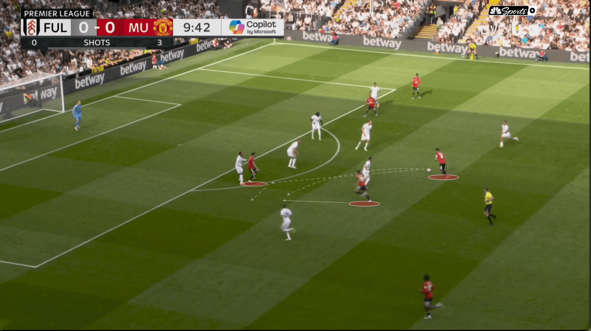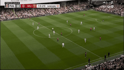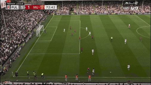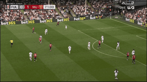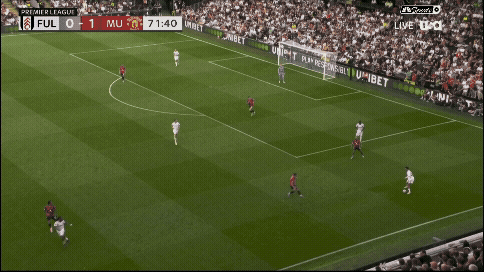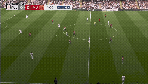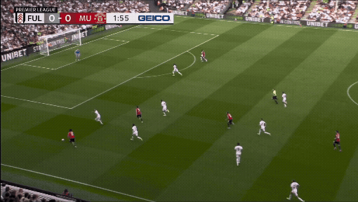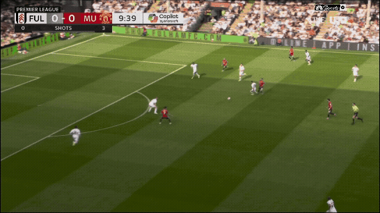 «Юнайтед» вроде бы успевает вернуться, но быстрая потеря Диогу Далота и снова дыра в обороне. Несмотря на то что «Фулхэм» зеркалил схему и лишал «Юнайтед» ширины, уже через секунды они создают численное преимущество 2 в 1 против Далота и 3 в 2 против Далота и Йоро.